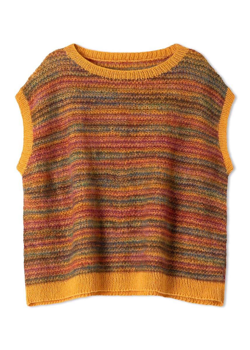 Lana Grossa „Ecopuno“ (72% bomull, 17% ren ny ull (merino), 11% alpakka (baby), løpelengde 215 m/50 g), 100 (150 - 150) g i safrangul (farge 216) og Lana Grossa „Cottonhair“ (70% mohair (superkid), 30% bomull, løpelengde 450 m/50 g), 50 (100 - 100) g i umbra/bær/okergul/gammelrosa/pink/fuchsia/røykblå (farge 106); pinner nr. 3,5 og nr. 4,5, 1 rundpinne nr. 3,5, 40 cm lang.