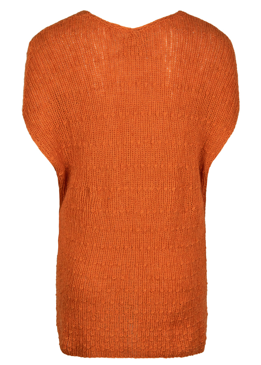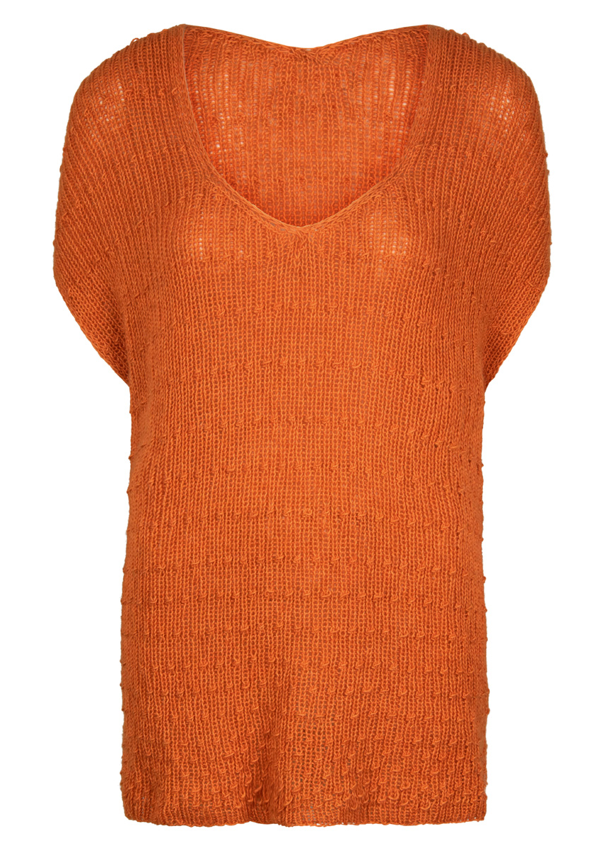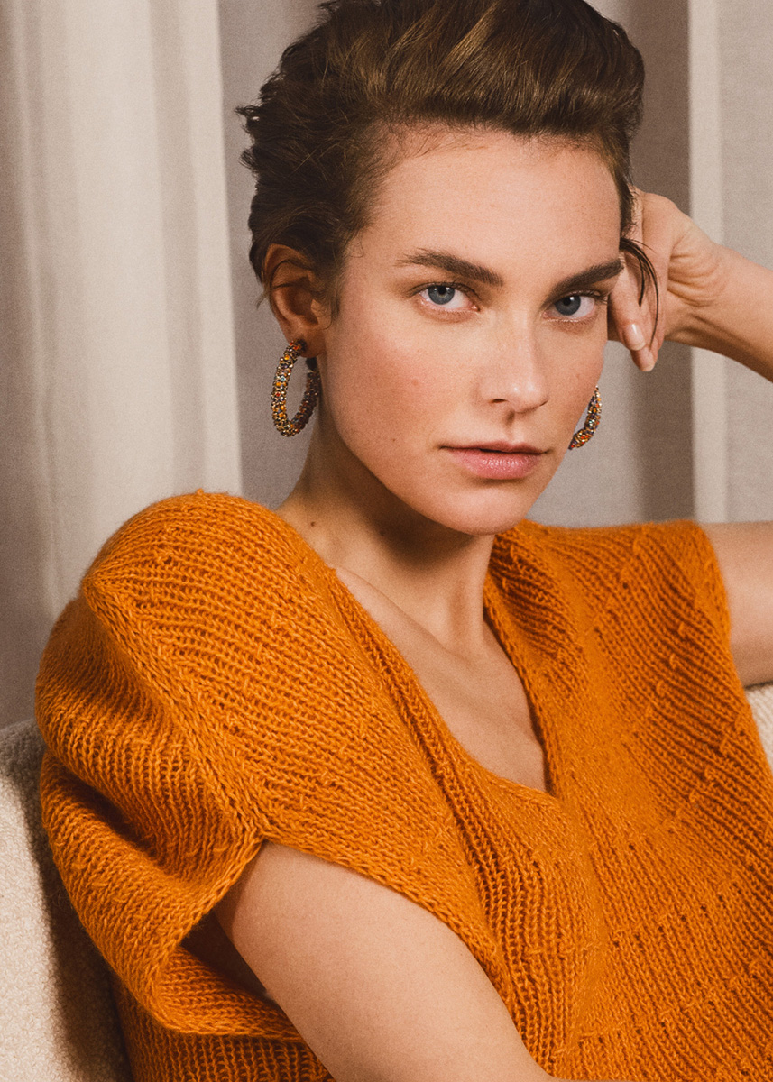 Lana Grossa „Ecopuno“ (72% bomull, 17% ren ny merinoull, 11% baby alpacka; löplängd 215m / 50g), 250 g i jaffaorange (faärg 5); stickor nr. 5.