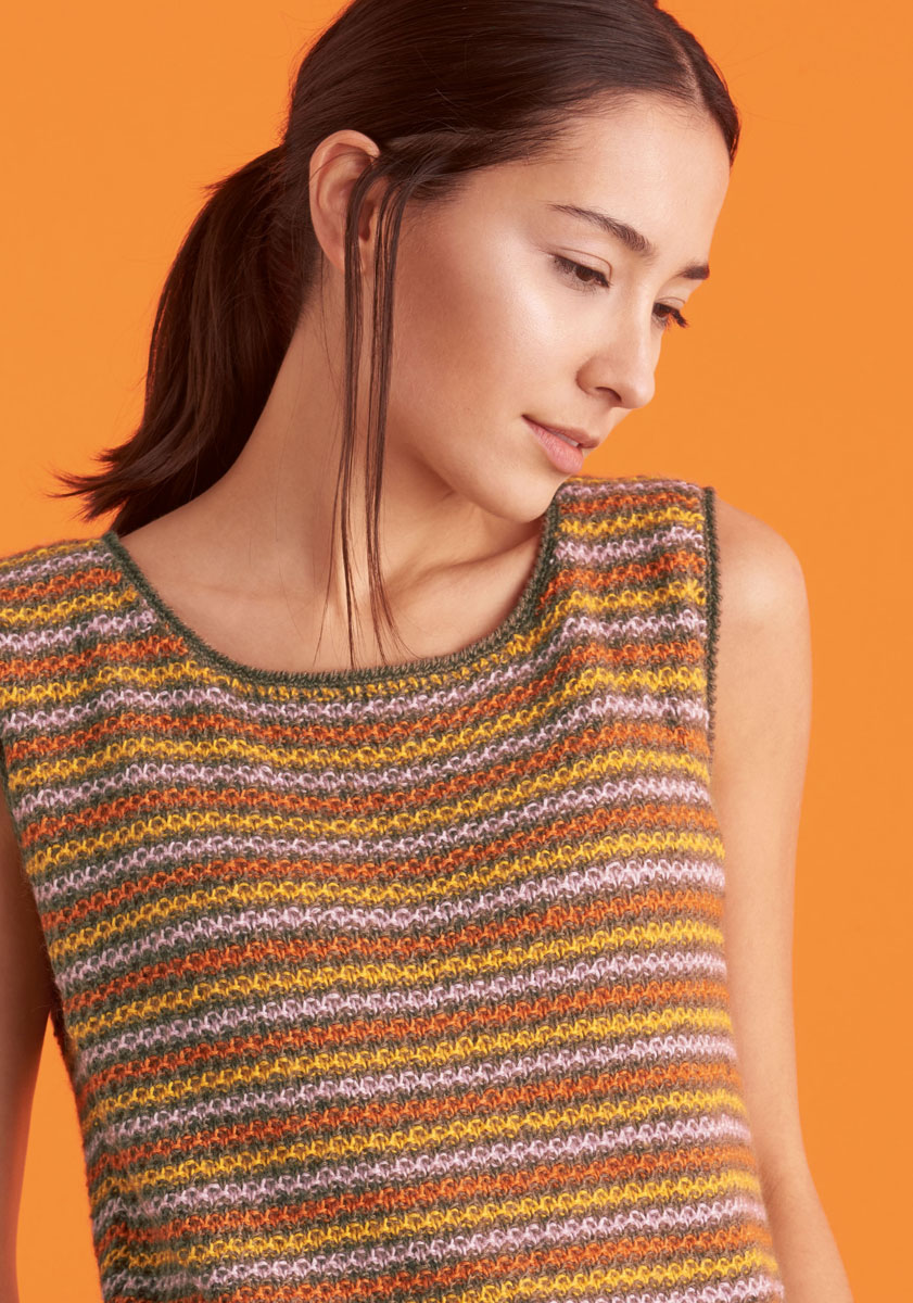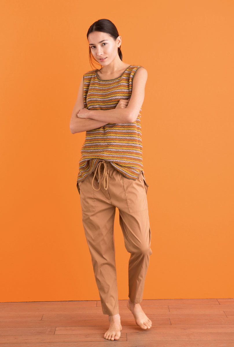 Lana Grossa-kvalitet ”Ecopuno” (75 % bomuld, 15 % ren ny uld, 10 % alpaka, løbelængde = ca. 225 m / 50 gr.): ca. 150(200-250) gr mørkebrun (fv 17), 50(100-100) gr orange (fv 5), 50(100-100) gr syren (fv 8) og 50(100-100) gr gul (fv 4), strikkepinde nr. 4, hæklenål nr. 3½