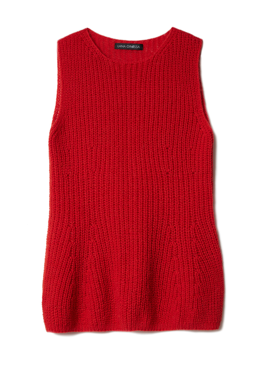 Lana Grossa-kvalitet „Ecopuno“ (72 % bomull, 17 % ren ny ull (merino), 11 % (baby) alpacka, löplängd = ca 215 m/50 g): ca 200 (250 - 250 - 300) g röd (färg 100); stickor nr 3 och nr 3,5; 1 kort rundsticka nr 3.