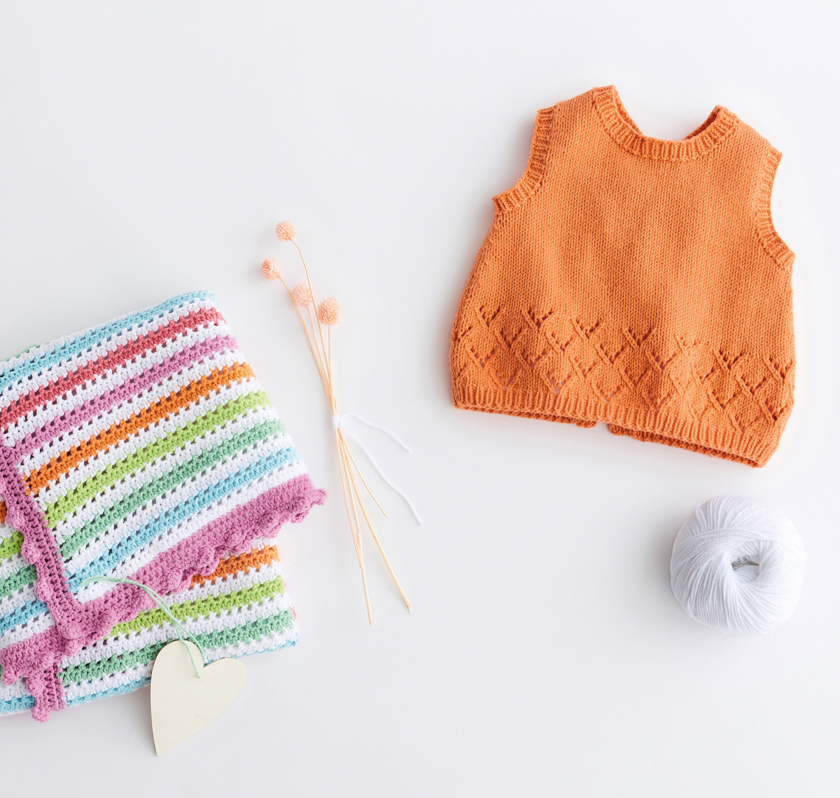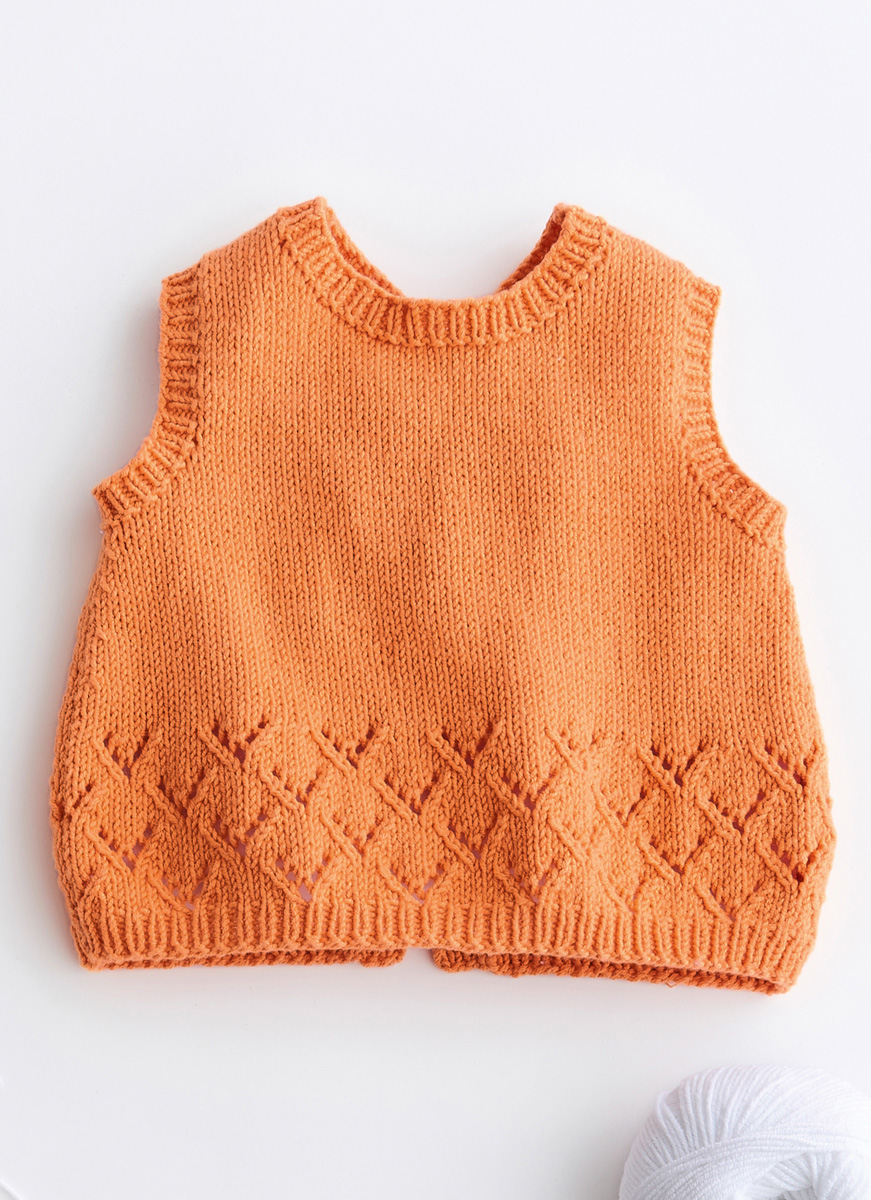 Lana Grossa-kvalitet ”Elastico” (96 % bomuld, 4 % polyester, løbelængde = ca. 160 m / 50 gr.): 100(100-100- 150) gr abrikos (fv 158), strikkepinde nr. 3 og 3½, rundpind nr. 3, 40 cm.