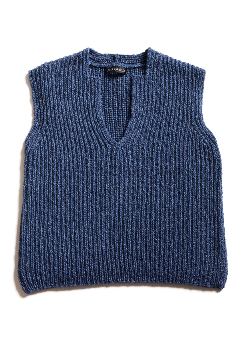 Lana Grossa-kvalitet „Fantasia“ (50 % bomull, 24 % viskos, 16 % (baby) alpacka, 10 % ren ny ull (merino extrafin), löplängd = ca. 125 m/50 g): ca. 300 (350 - 400) g i blå (färg 16); stickor nr. 4,5.