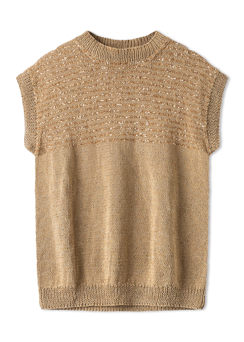 Garn: Lana Grossa «Filo Lurex» (94 % bomull, 6 % polyester, LL = ca. 145 m/50 g): 250 (300 - 300 - 350) g kamel (frg 17); Lana Grossa «Glamour» (55 % polyamid, 45 % polyester, LL = ca. 115 m/25 g): 50 (50 - 50 - 50) g kamel (frg 11). Pinner: Nr. 3 og 3,5, kort rundpinne nr. 3