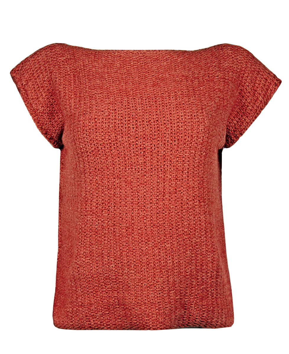 Lana Grossa-kvalitet „Fourseason“ (45 % virgin ull (extrafin merino), 40 % (bio) bomull, 15 % (rec.) kashmir löplängd = ca. 105 m / 50 gr.): ca. 300(350-400) gr koppar (färg 15), stickor nr. 7, virknål nr. 4½.