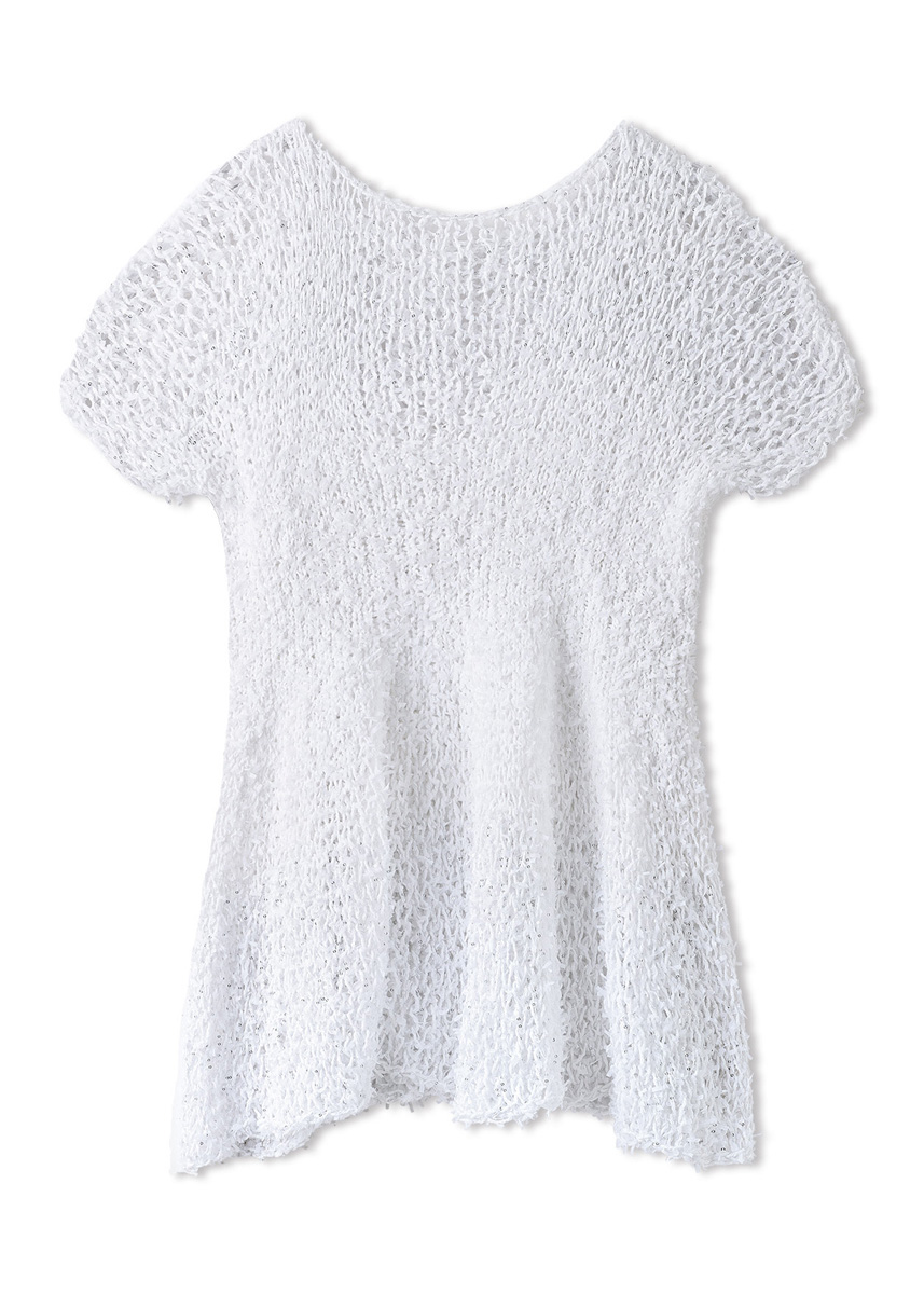 Garn: Lana Grossa «Frizzante» (54 % bomull, 46 % polyamid, LL = ca. 105 m/50 g): Ca. 200 (250 - 250 - 300) g hvit (frg 16); Lana Grossa «Glamour» (55 % polyamid, 45 % polyester, LL = ca. 115 m/25 g): Ca. 75 (75 - 75 - 100) g sølvgrå (frg 1). Pinner: Rundpinner nr. 4, nr. 6, nr. 8 og nr. 12.