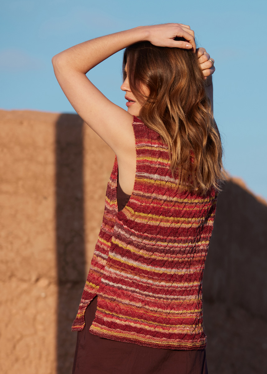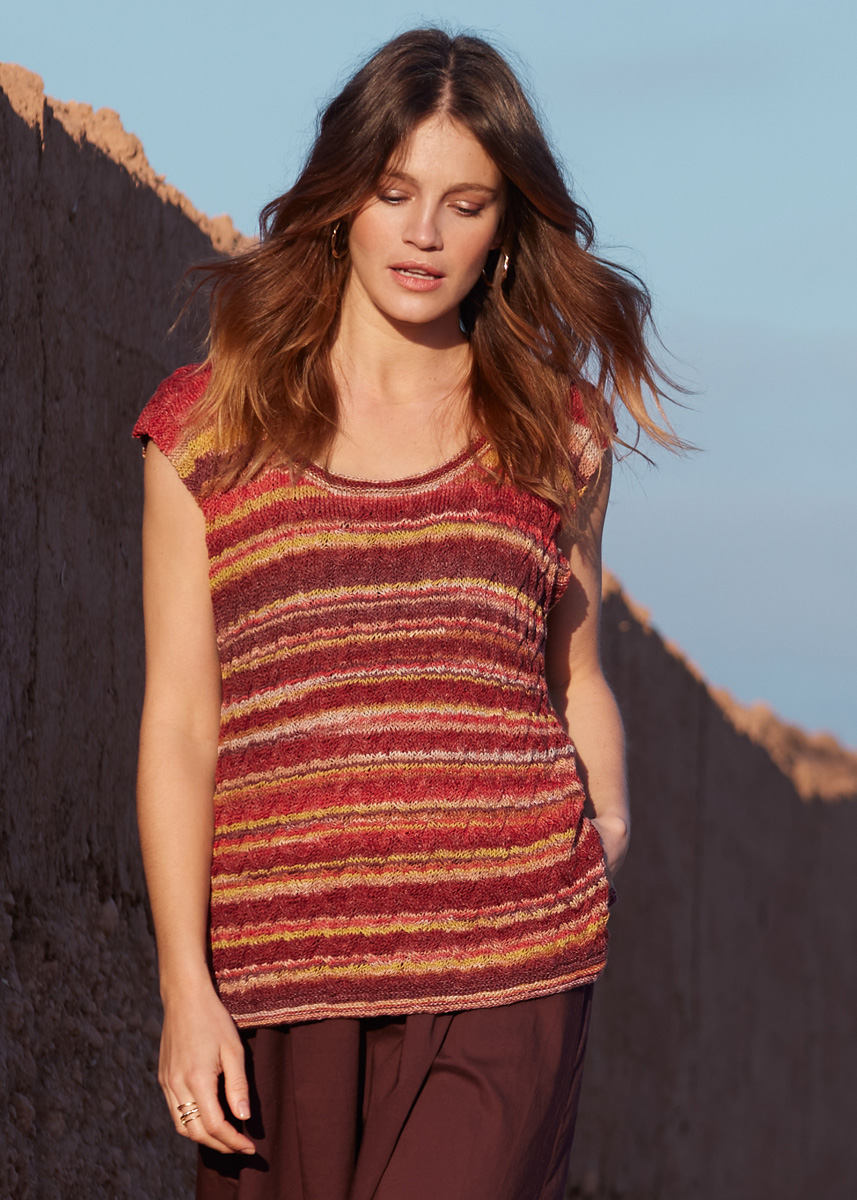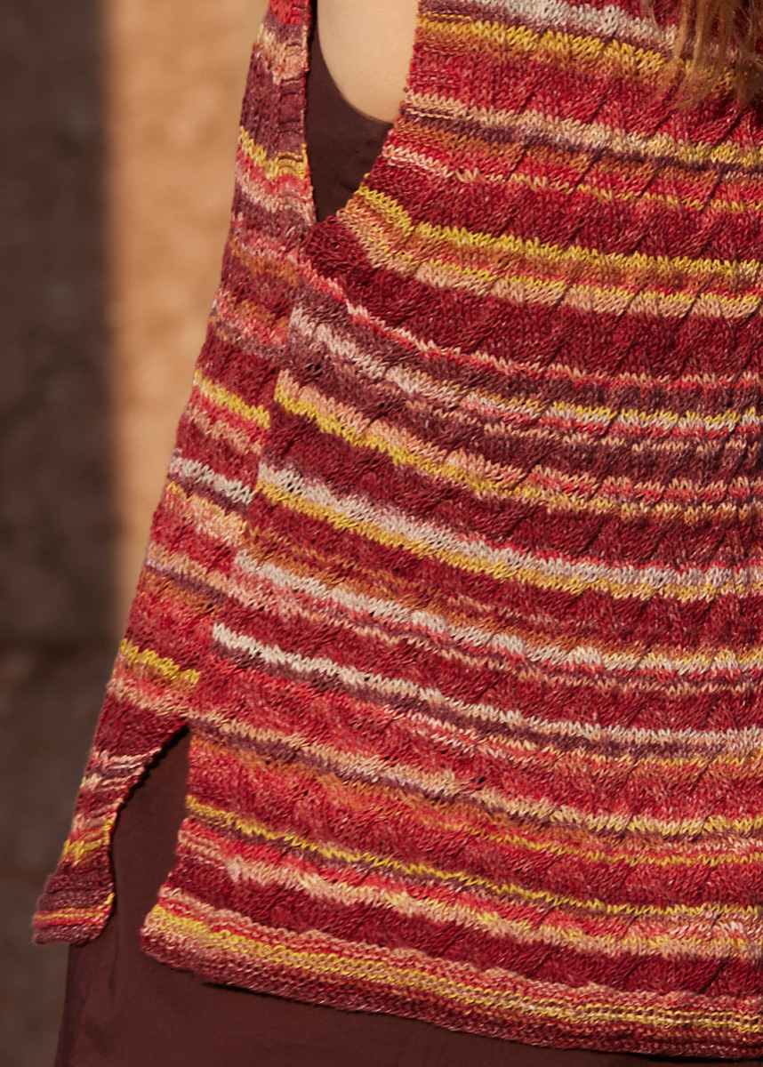 Lana Grossa-kvalitet „Gomitolo Lino“ (60 % bomull, 28 % viskos, 12 % lin, löplängd = ca 290 m/100 g): 4 (4 - 4 - 5) nystan = ca 400 (400 - 400 - 500) g burgund/nougat/rosabeige/rost/brunröd (färg 2014); stickor nr. 3,5 och 4; 1 kort rundsticka nr. 3,5; flätsticka.