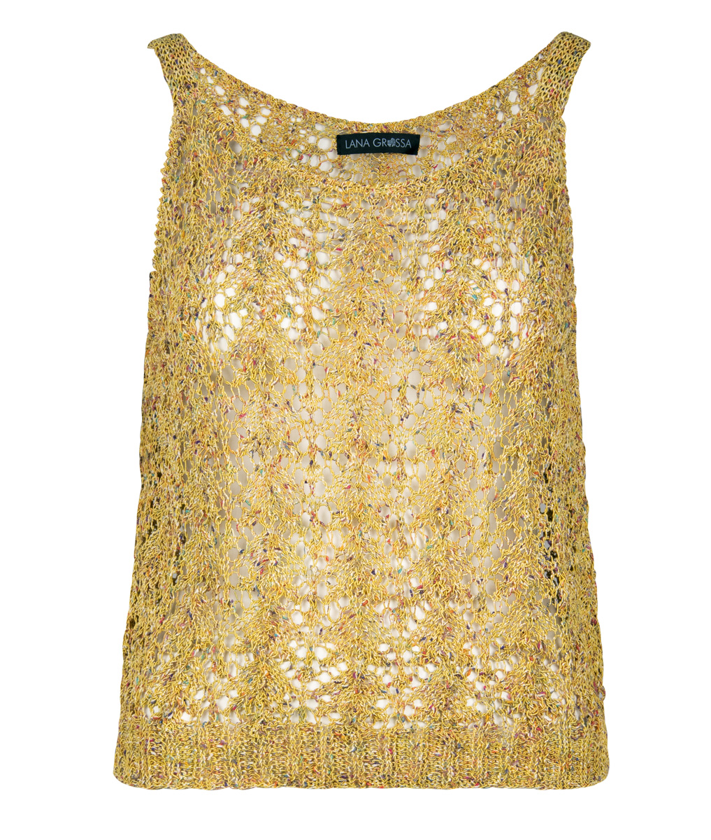 Lana Grossa-kvalitet „About Berlin Spotty” (55 % bomull, 26 % polyamid, 19 % polyester, löplängd = ca. 125 m/50 g): ca. 200 g färgglad senapsgul (färg 3); stickor nr. 3,5 och 4,5, strumpstickor nr. 4,5, 1 ullvirknål nr. 3,5.