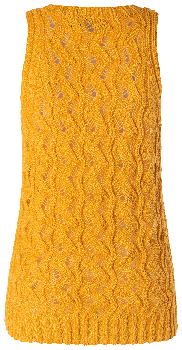Lana Grossa-kvalitet „Linarte” (40 % viskos, 30 % bomull, 20 % lin, 10 % polyamid, löplängd = ca. 125 m/50 g): ca. 350 g gul (färg 307); stickor nr. 4 och 5, 1 rundsticka nr. 4, 50 cm lång.