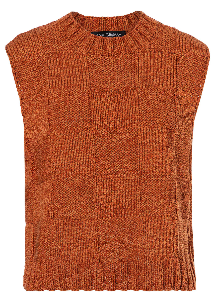Lana Grossa Landlust Sommerseide (50% silke, 50% bomull, löplängd 170 m/50 g), 350 (400 – 450) g rödbrun (färg 37); stickor nr. 4 och 4,5, 1 rundsticka nr. 4,5, 40 cm lång.