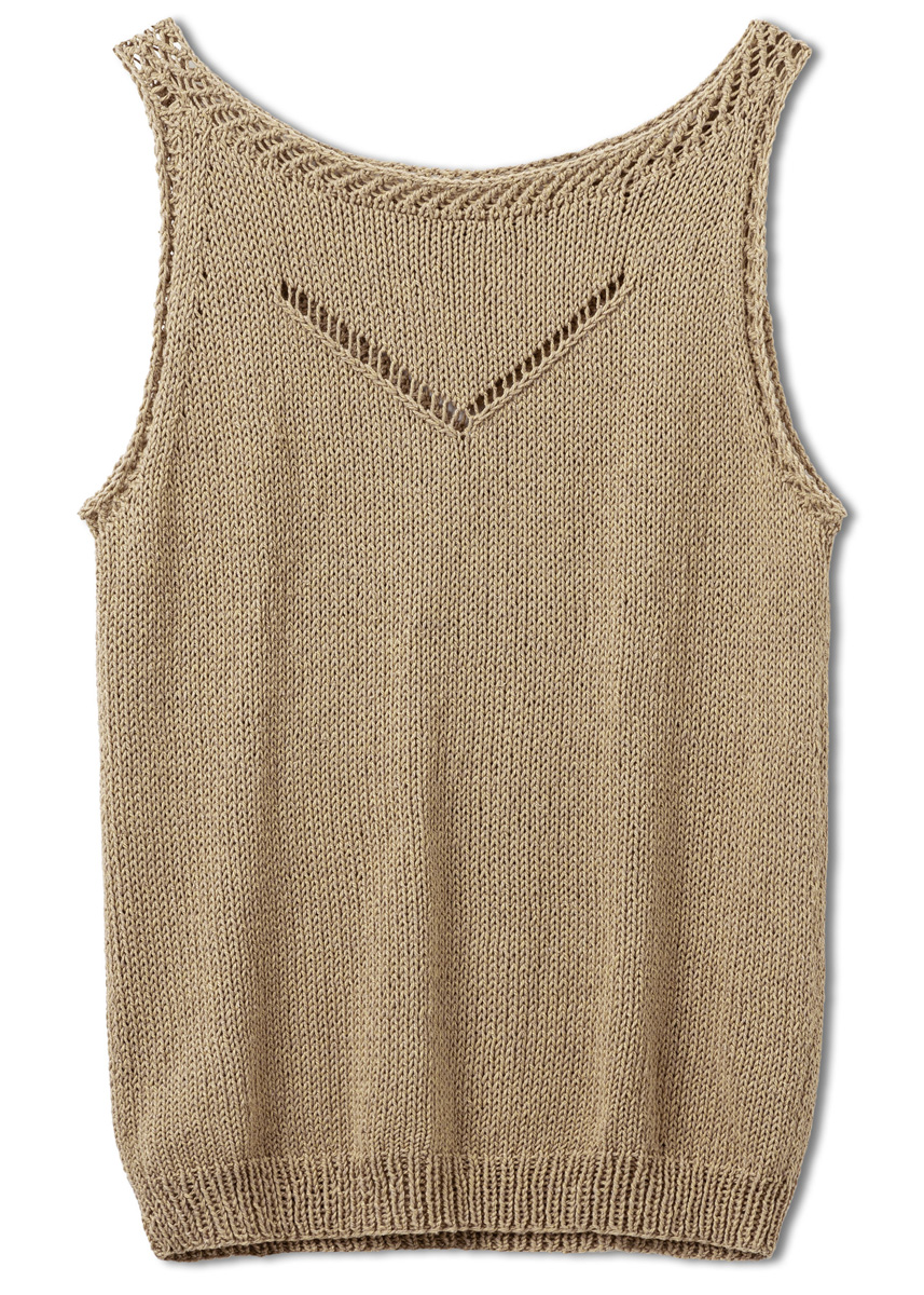 Lana Grossa Landlust Sommerseide (50% Seide, 50% bomull, löplängd 170 m/50 g), 150 (200 – 250) g kamel (färg 44); stickor nr. 4 och 4,5, 1 rundsticka nr. 3,5, 40 cm lång.