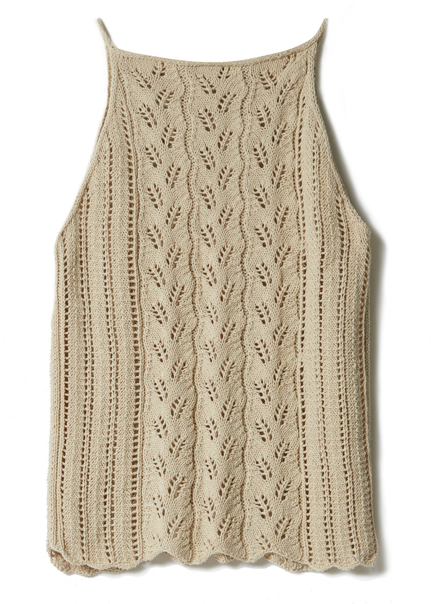 Lana Grossa Landlust Sommerseide (50% silke, 50% bomull, löplängd 170 m/50 g), 200 (250 – 300) g natur (färg 2); stickor nr. 3,5, 1 rundsticka nr. 3, 40 cm lång.