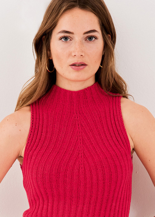 Lana Grossa Linarte (40% viskos, 30% bomull, 20% lin, 10% polyamid, löplängd 125 m/50 g), 300 (350 – 400) g röd (färg 315); stickor nr. 4 och rundstickor nr. 4, 40 och 80 cm lång.