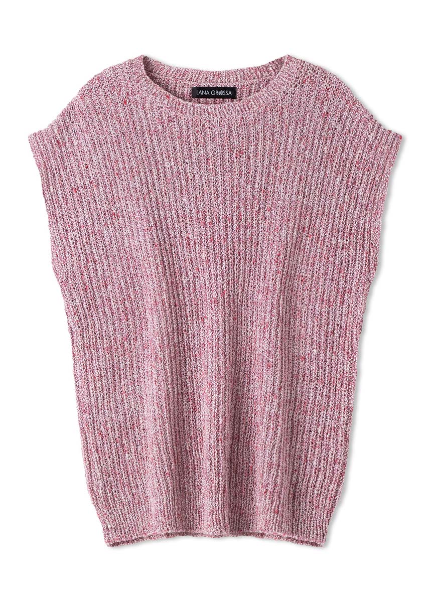 Lana Grossa „Maglia“ (92% bomull, 8% polyester, løpelengde 155 m/50 g), 300 (350 - 350 - 400) g i råhvit/syklamen/rød/rosa (farge 14); pinner nr. 3,5, 1 rundpinne nr. 3,5, 40 cm lang.