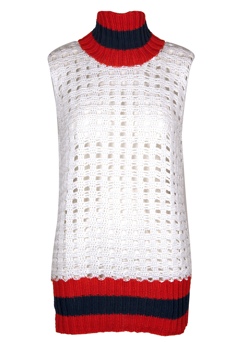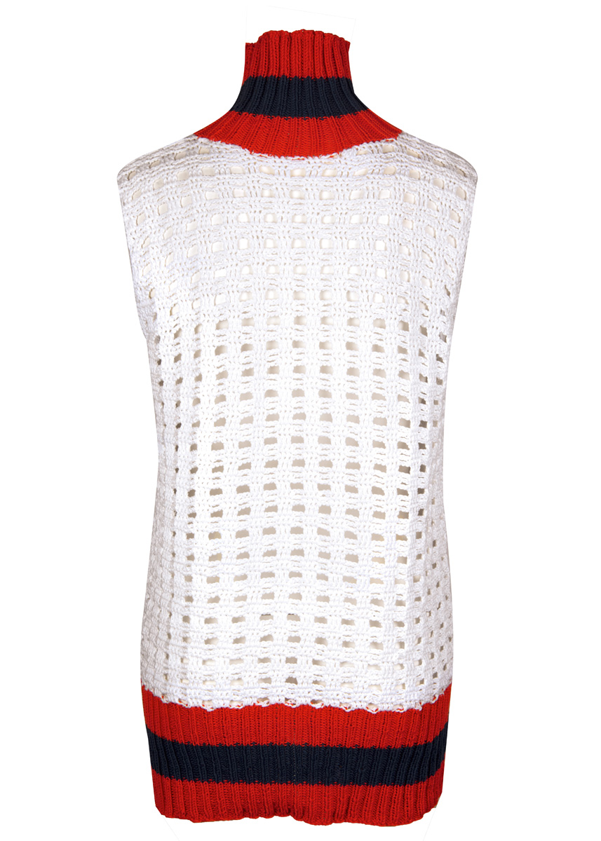 Lana Grossa-kvalitet „Pima” (100 % Pima bomull, löplängd = ca. 125 m/50 g): ca. 300 (350) g vit (färg 23), ca. 100 g korall (färg 7) och ca. 50 g nattblå (färg 25); 1 virknål nr. 4,5, rundsticka nr. 3, 40 och 80 cm lång.