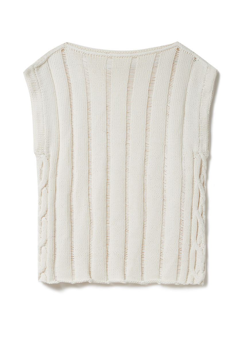 Lana Grossa „Promessa“ (70 % (bio) bomull, 30 % återunnen polyamid, löplängd 125 m/50 g), 300 (350 – 350) g crème (färg 14); rundsticka nr. 5, 80 cm lång, strumpstickor nr. 4,5.