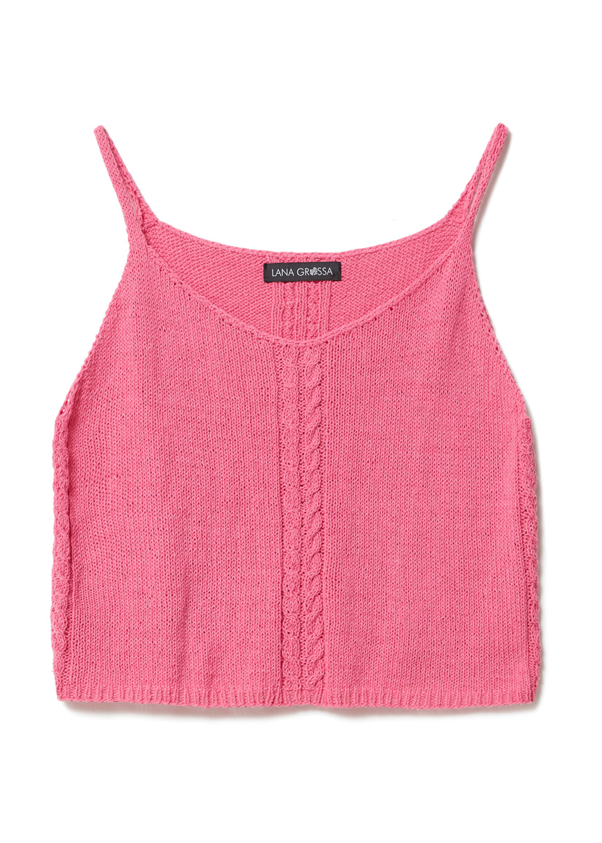 Lana Grossa „Setapura“ (100 % silke, löplängd 200 m/50 g), 150 (150 – 150 - 200) g pink (färg 8); stickor nr. 3 och 3,5; flätsticka; virknål nr. 3.