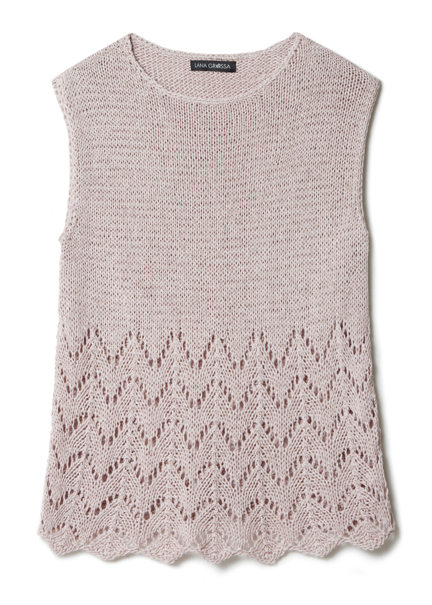 Lana Grossa Solo Lino (80% återvunnen lin (viskos), 20% lin, löplängd 120 m/50 g), 400 (450 – 500 – 550) g pärlrosa (färg 44); stickor nr. 6 och 7, samt 1 virknål nr. 5. OBS: Modellen stickas med dubbla trådar!