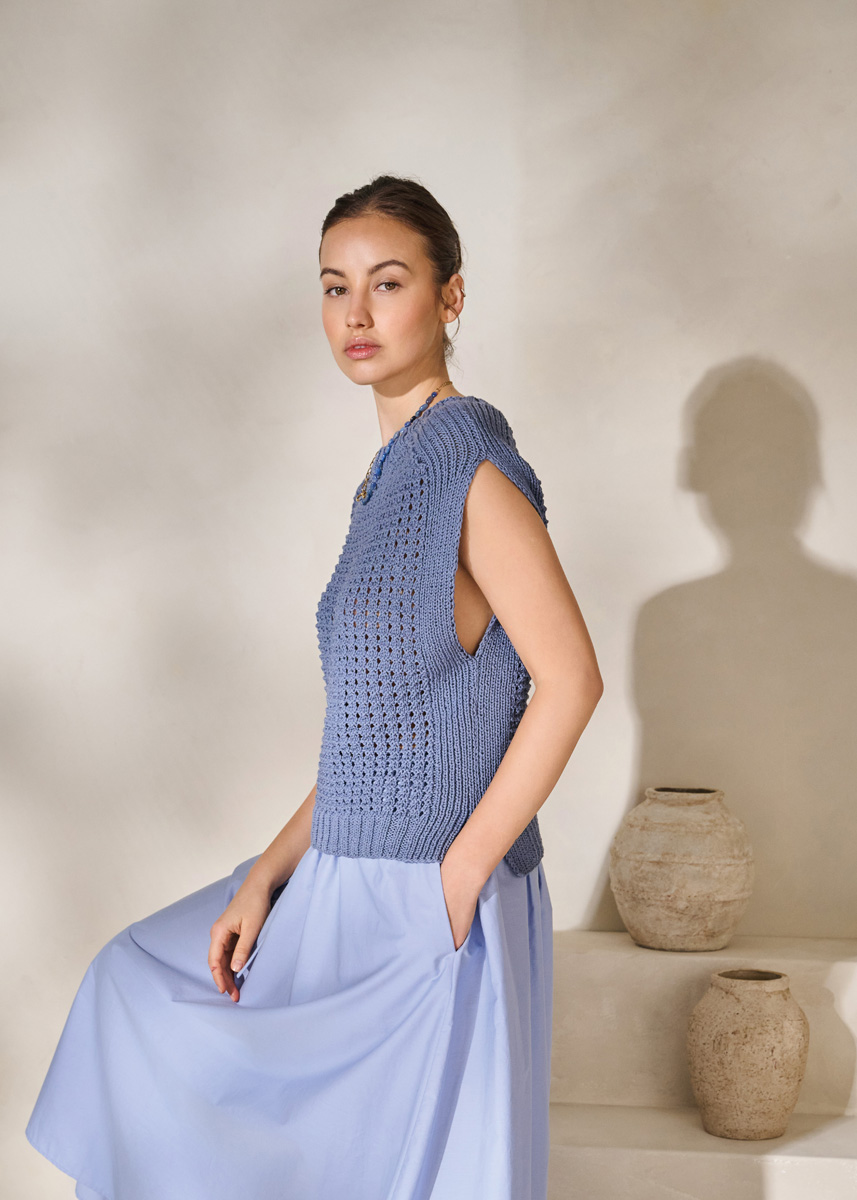 Lana Grossa-Kvalitet Tessera (100% bomuld, løbelængde 115 m/50 g), 350 (400 – 450) g jeans (farve 12); strikkepinde nr. 5 og rundpind nr. 4½, 40 cm.