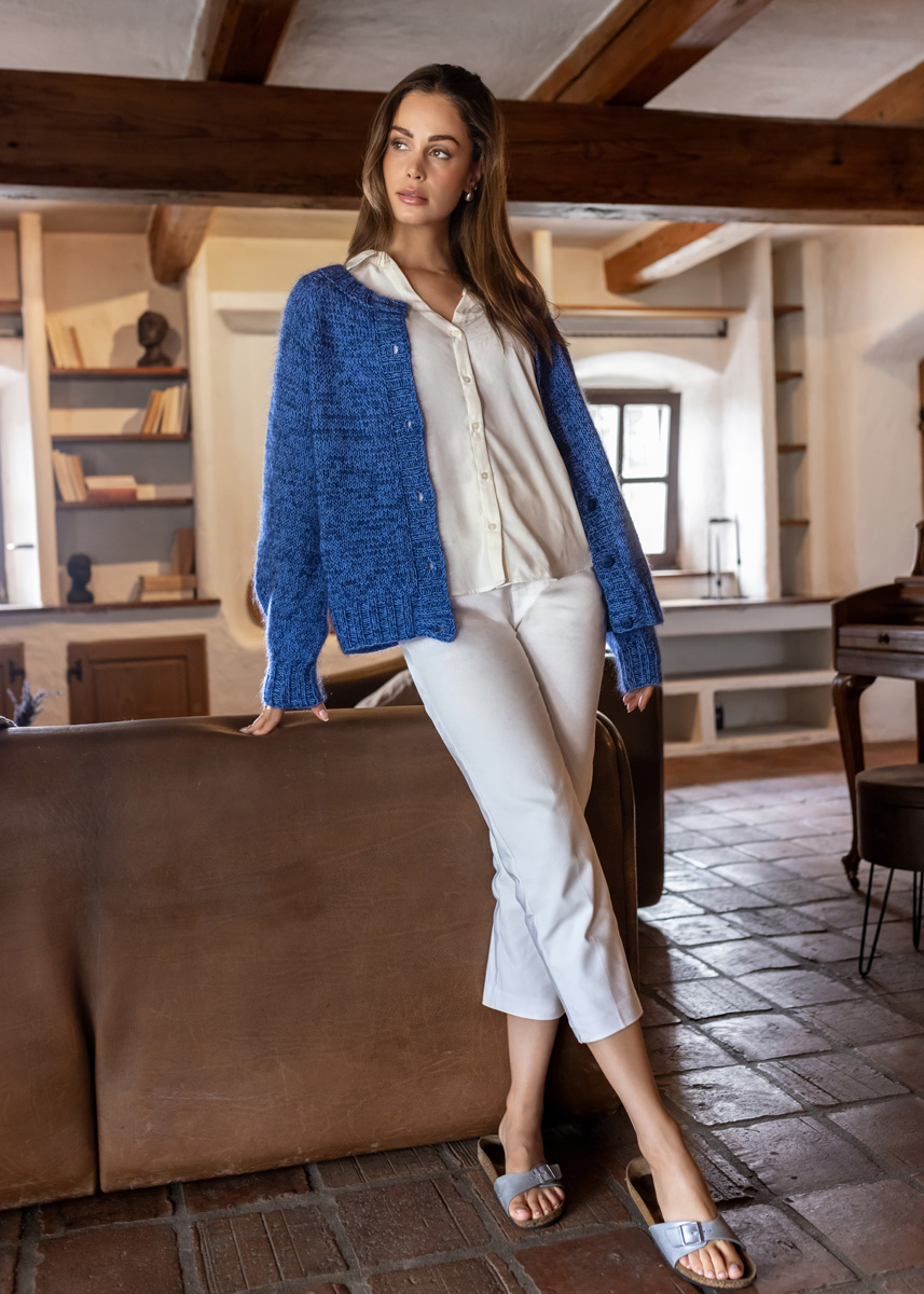 Cardiganen stickas sömlöst i ett stycke uppifrån och ned med dubbla trådar, 1 tråd av var garn-kvalitet. Modellen har en totallängd av ca. 55 (57 - 59 - 61 - 63 - 66) cm och en bröstövervidd av 18 cm vid 80 cm bröstomkrets (18 cm vid 88 cm bröstomkrets - 18 cm vid 96 cm bröstomkrets - 18 cm vid 104 cm bröstomkrets - 18 cm vid 116 cm bröstomkrets - 14 cm vid 128 cm bröstomkrets).