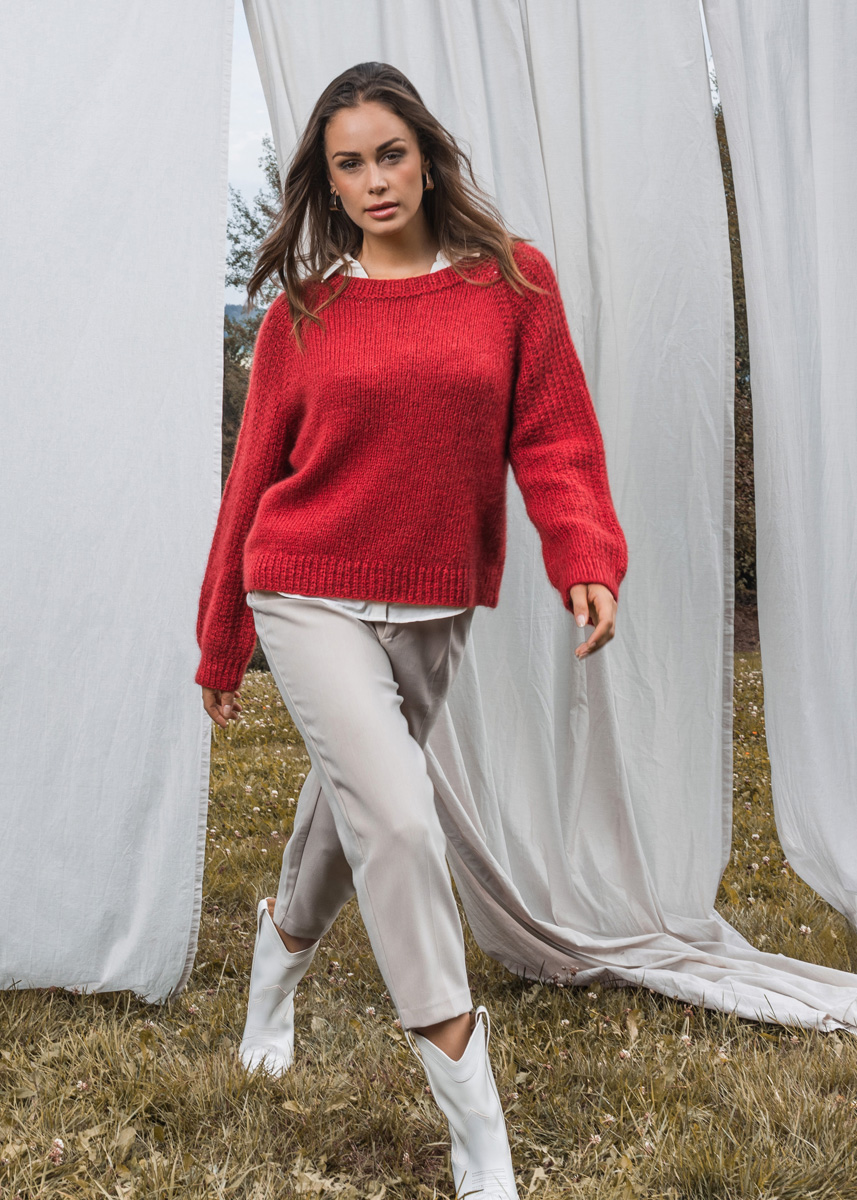 Pullovern stickas i ett stycke uppifrån och ned och har en totallängd av 50 (52 - 54 - 56 - 58 - 61) cm och en bröstövervidd av 16 cm vid 80 cm bröstomkrets (16 cm vid 88 cm bröstomkrets - 16 cm vid 96 cm bröstomkrets - 16 cm vid 104 cm bröstomkrets - 16 cm vid 116 cm bröstomkrets - 14 cm vid 128 cm bröstomkrets).