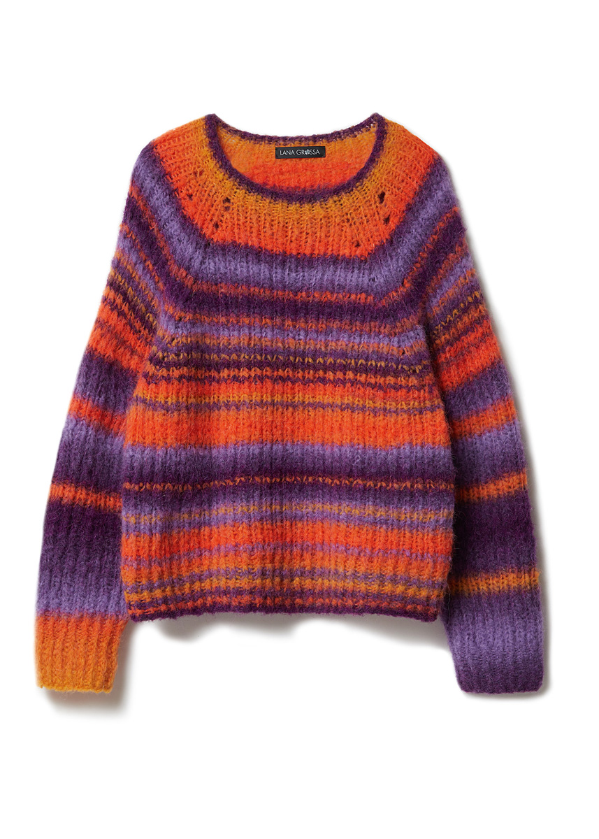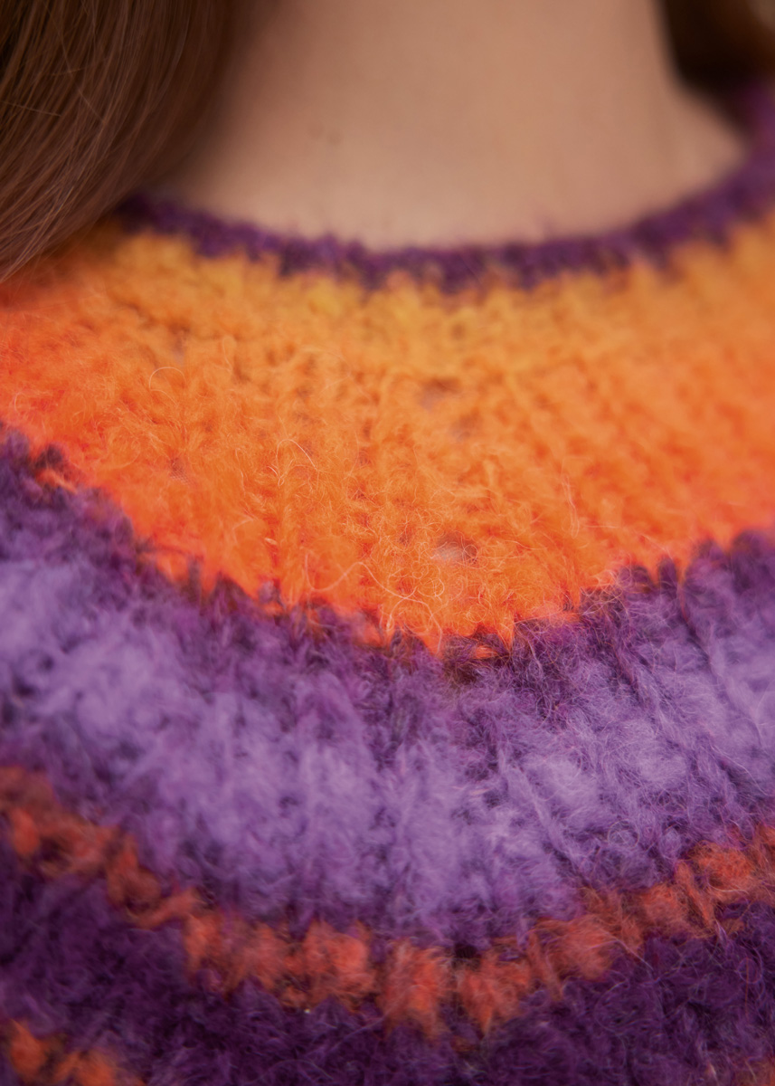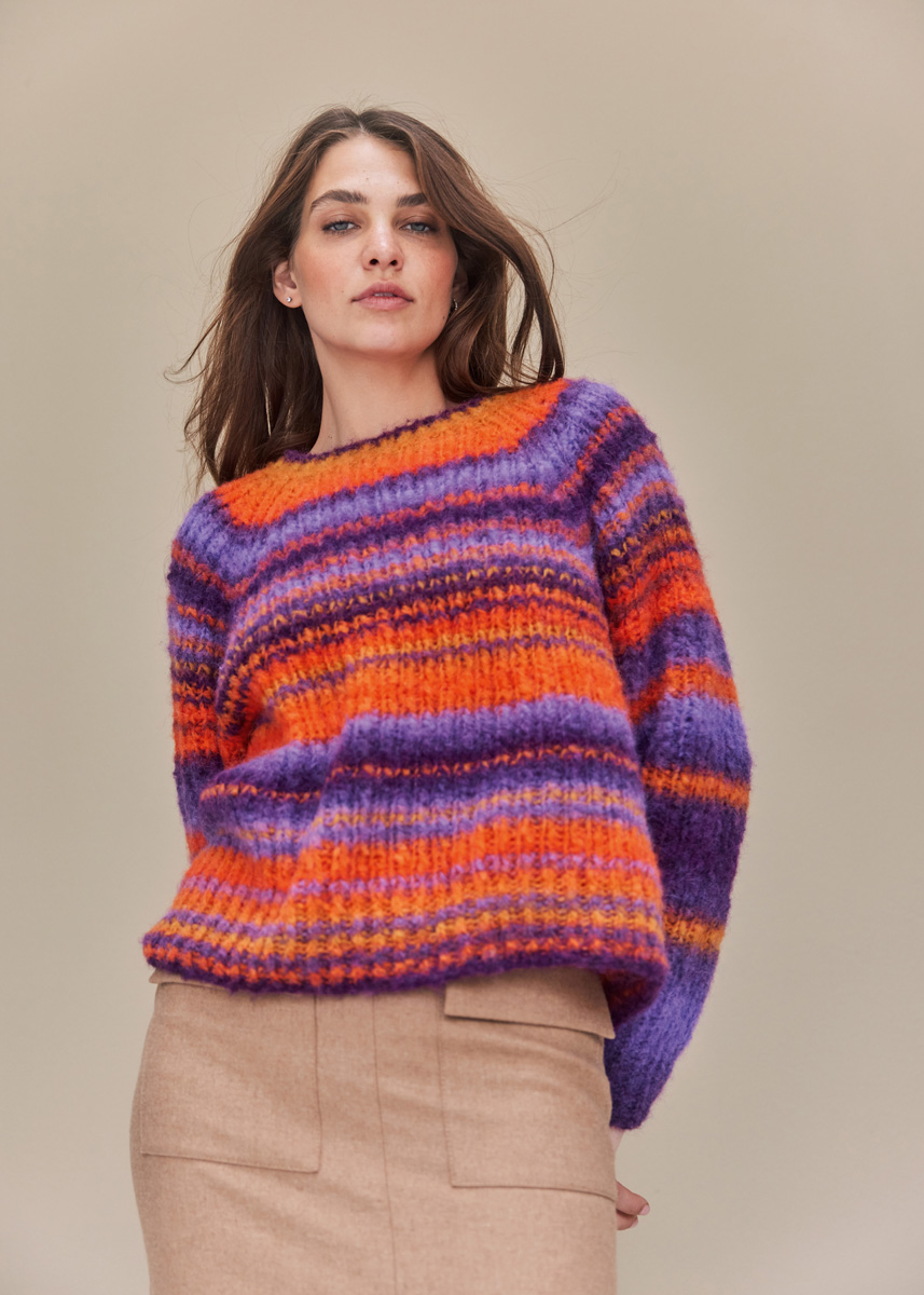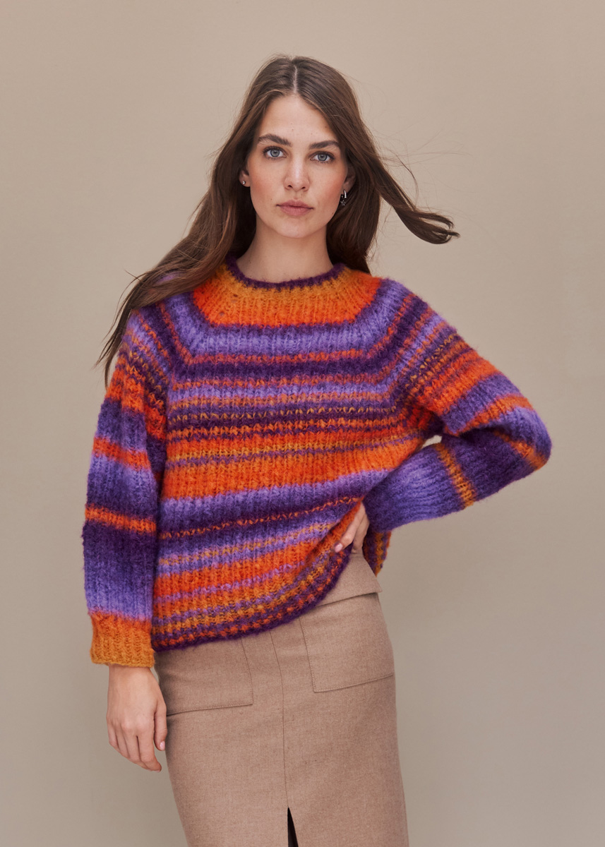 Lana Grossa-kvalitet ”Gigante” (70 % alpaka (fine), 30 % polyamid, løbelængde = ca. 300 m / 100 gr): ca. 200 (300 – 300 – 400) gr mørkviolet/gul/grålilla/orange/ blåviolet (fv 2), en kort og en lang rundpind nr. 5 og 6, strømpepinde nr. 5 og 6. Pulloveren strikkes samlet oppefra og ned.