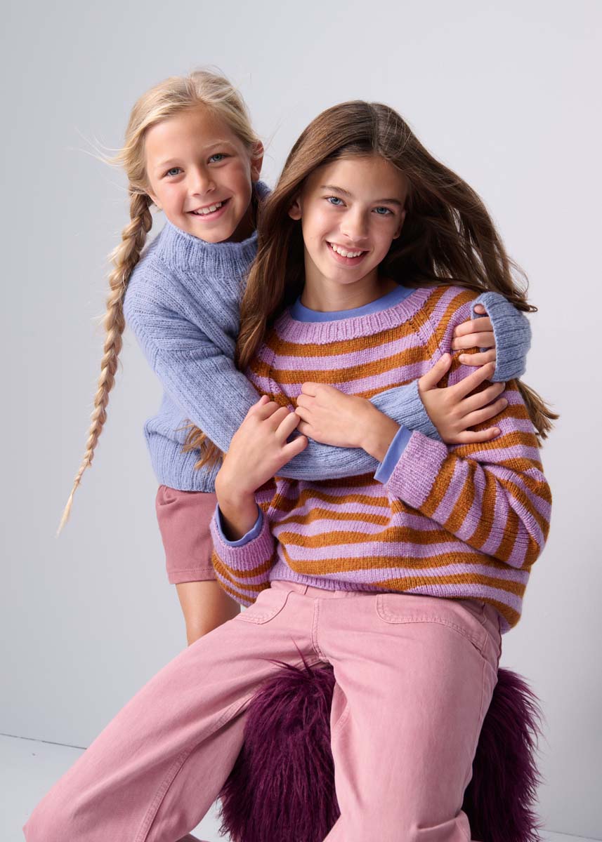 Lana Grossa-kvalitet „Cool merino“ (90% ren ny ull (merino), 10% polyamid, löplängd = ca 150 m/50 g): ca 150 (200 - 200 - 200) g rost (färg 18) och ca 200 (200 - 200 - 250) g syren (färg 32); kort och lång rundsticka nr. 4 och nr. 4, 5; strumpstickor nr. 4 och 4, 5. Pullovern stickas uppifrån och ned i ett stycke.