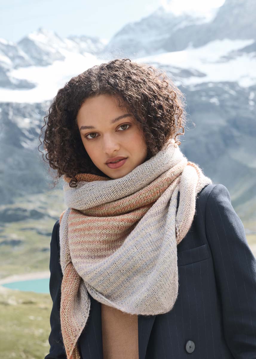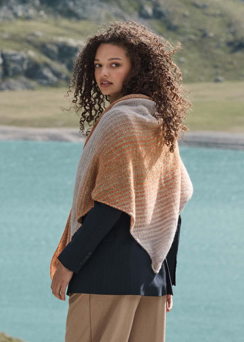 Det trekantede skjerfet strikkes vekselvis 2 p med trådenden fra innsiden av nøstet og 2 p med trådenden fra utsiden.