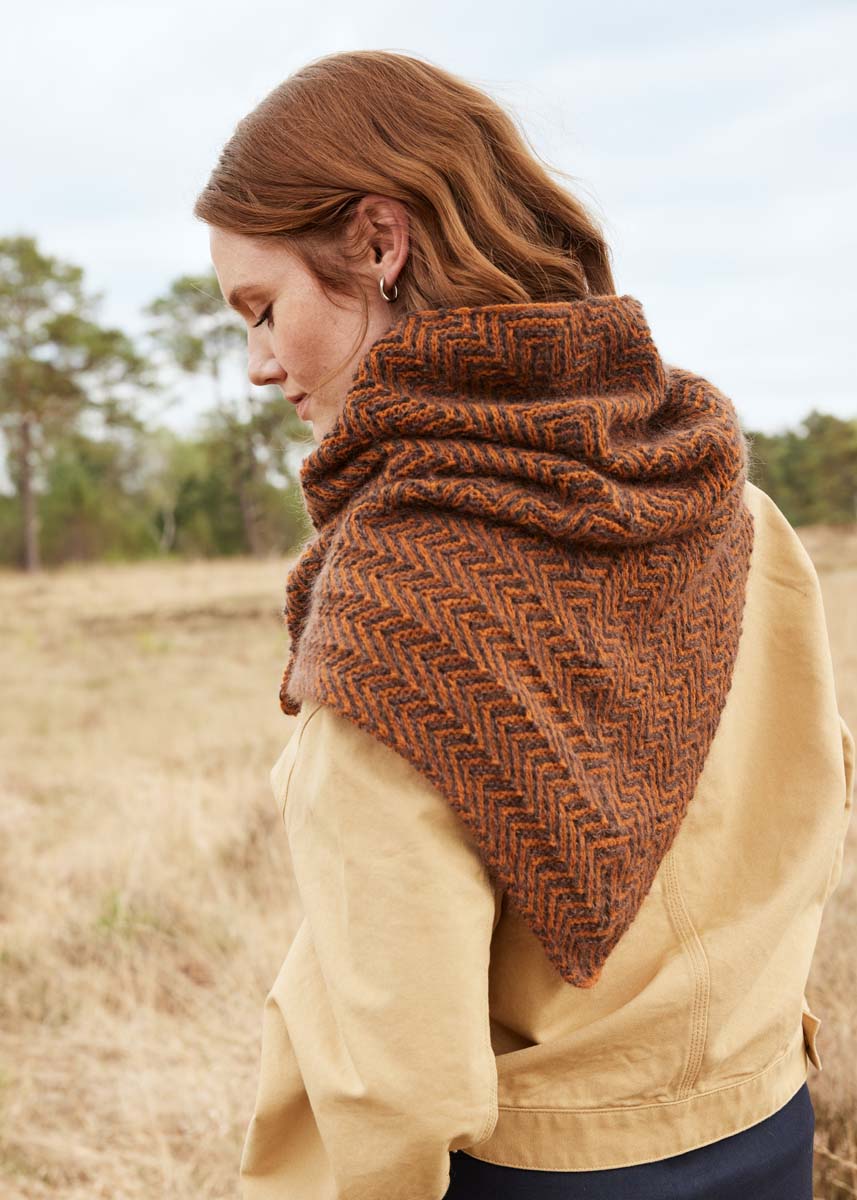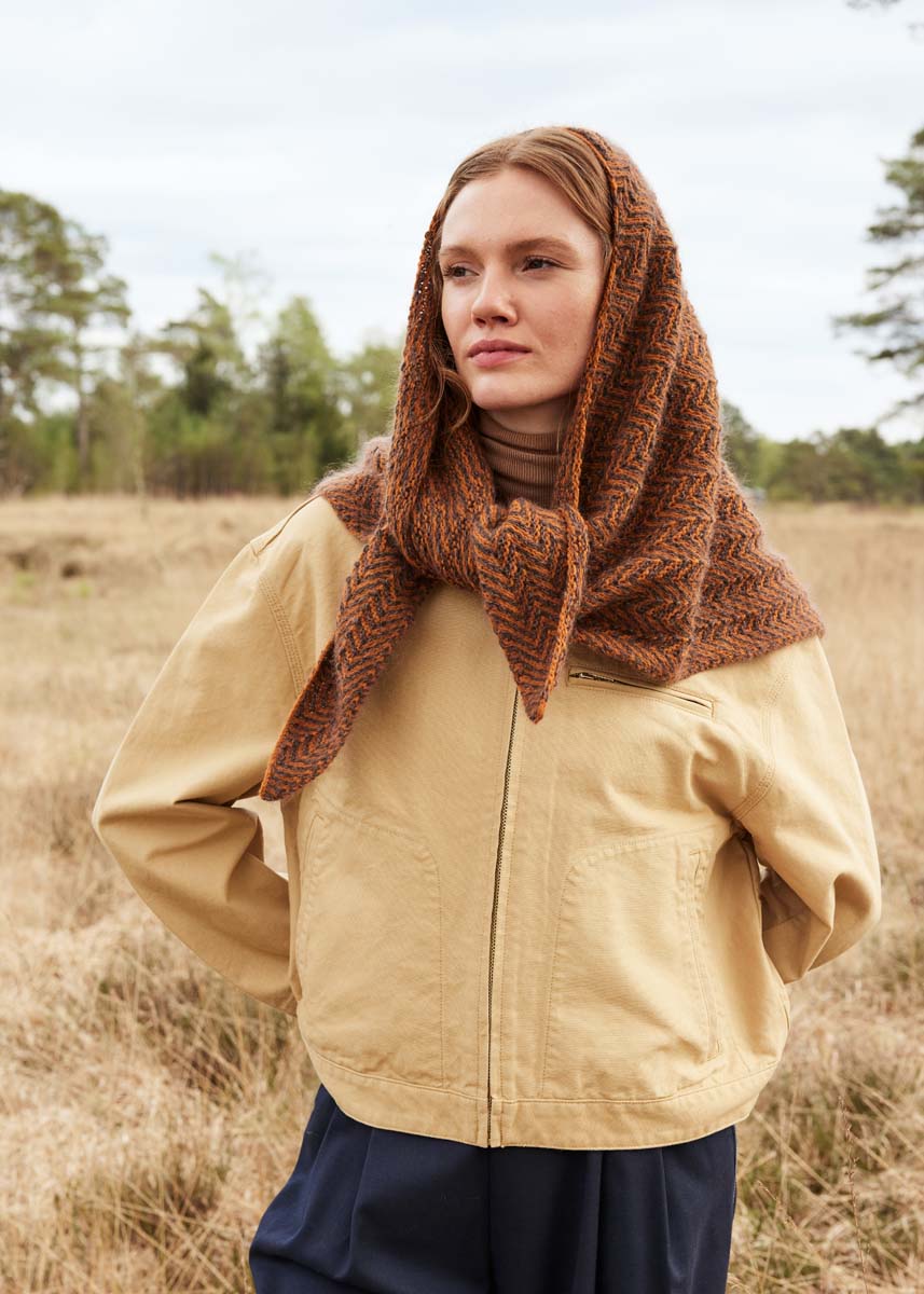 Lana Grossa Cashmere 16 Fine (80 % ren ny ull (merino ekstrafin), 10 % kasjmir, 10 % polyamid, løpelengde 320 m/50 g), 100 g cognac (farge 56), Lana Grossa Silkhair (70 % mohair (superkid), 30 % silke, løpelengde 210 m/25 g), 50 g mokka (farge 168) og Lana Grossa Cool Wool Lace (100% ren ny ull (merino ekstrafin), løpelengde 400 m/50 g), 25 g i svartbrun (farge 57), rundpinne nr. 6. Tips: Cool Wool Lace og Silkhair strikkes sammen med doble tråder, Cashmere 16 Fine strikkes med enkel tråd!
