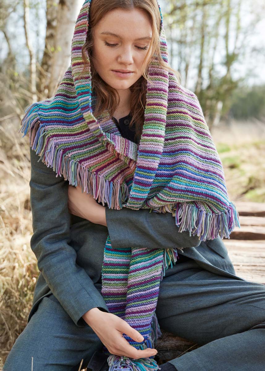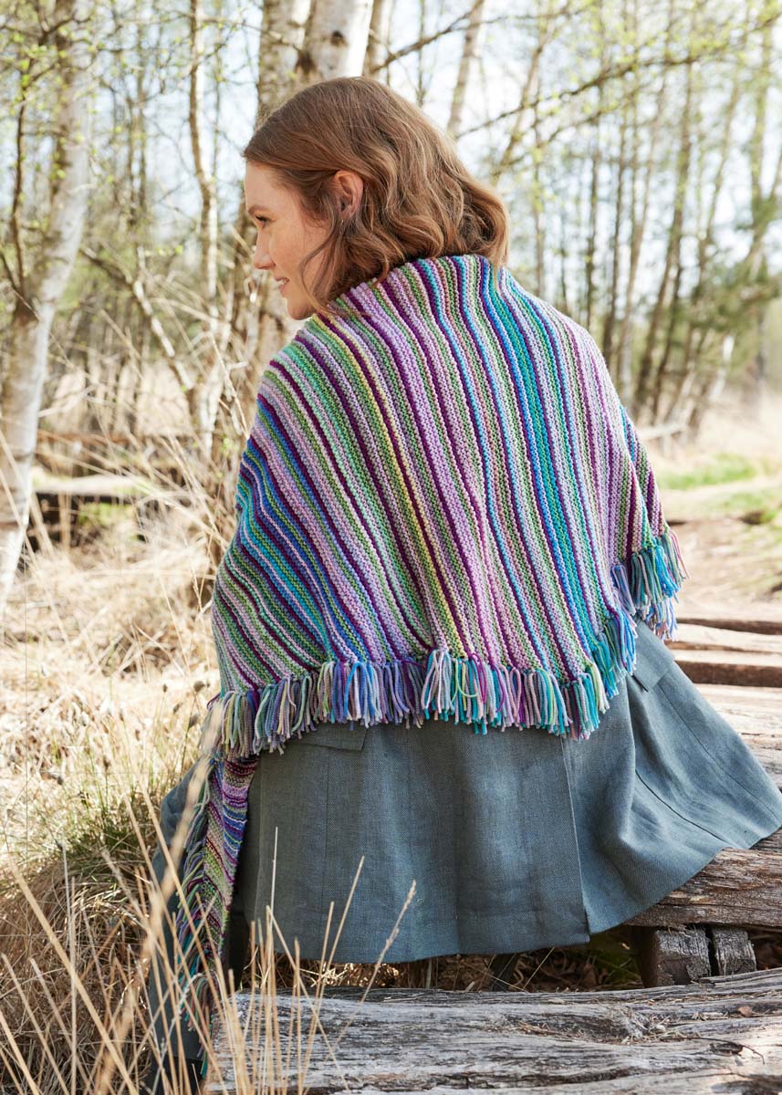 Lana Grossa Farfalla (94% ren ny ull (merino extrafine), 6% polyamid, LL 340 m/100 g), 200 g dus-/grågrønn/syrin/ fiolett/blå/rosé/lys grå/turkis/ gråblå/beige/grå/lys gul (frg 4) og Lana Grossa Cashmere 16 Fine (80% ren ny ull (merino extrafine), 10% kashmir, 10% polyamid, LL 320 m/50 g), 50 g mørk fuksia (frg 59), rosa (frg 60) og hvitgrønn (frg 67) Pinner/heklenål: Rundpinne nr. 4,5, heklenål nr. 4 for å feste frynsene