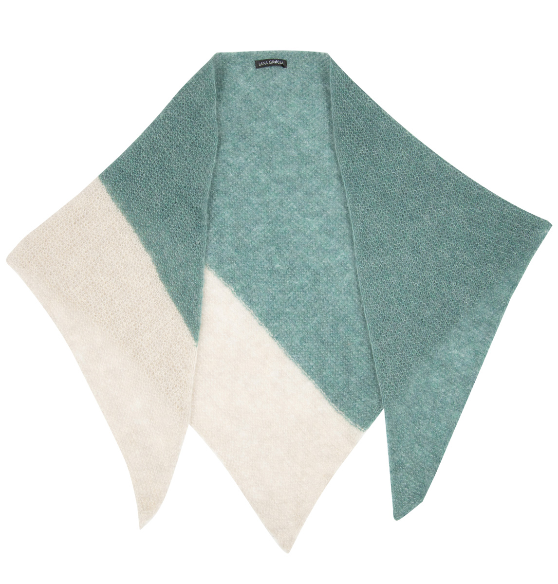 Lana Grossa-kvalitet ”Brigitte No. 3” (40 % mohair, 37 % ren ny uld, 23 % polyamid, løbelængde = ca. 100 m / 25 gr.): ca. 100 gr grågrøn (fv 17) og 50 gr beige (fv 18), strikkepinde nr. 5