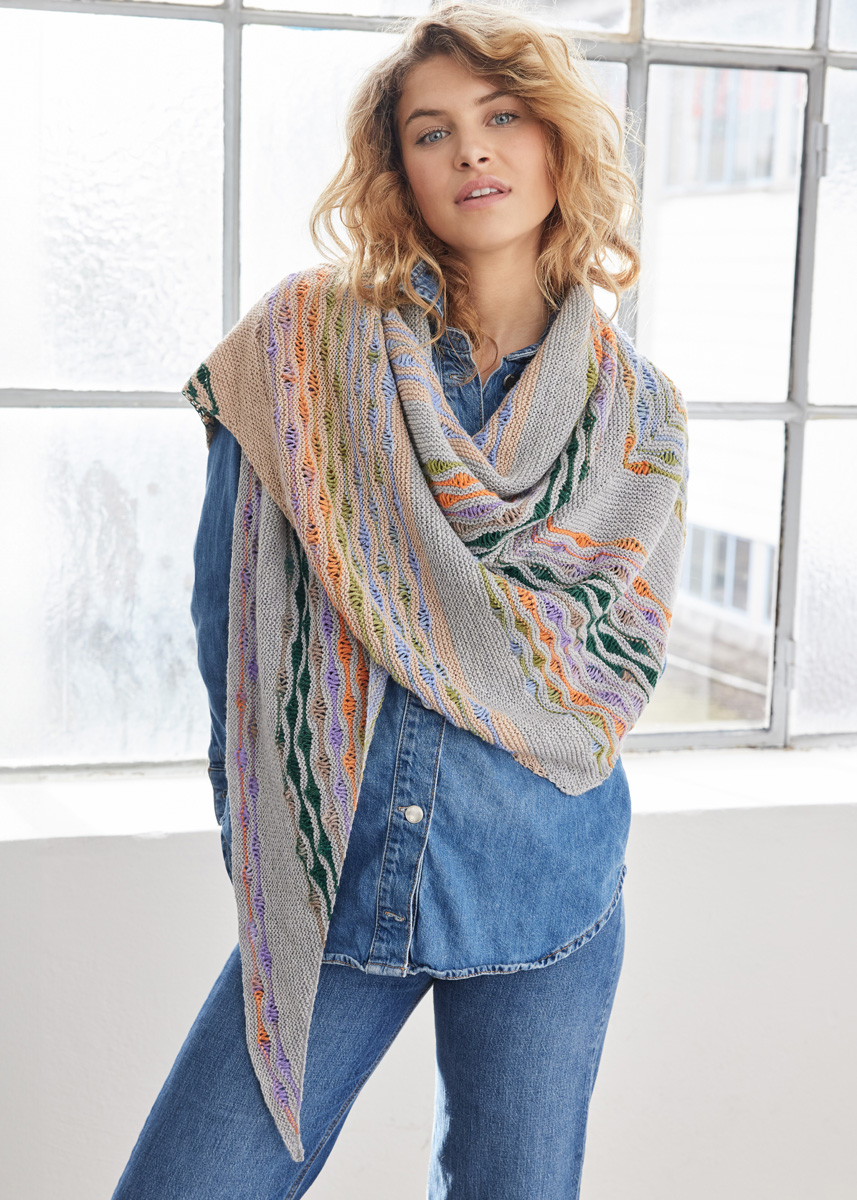 Materiale: Lana Grossa-kvalitet ”Cool Wool 4 Socks” (75 % ren ny uld (merino), 25 % polyamid, løbelængde = ca. 420 m / 100 gr.): 100 gr beige (fv 7711= Garn A) og 200 gr lysegrå (fv 7709 = Garn B) og Lana Grossa-kvalitet ”Cool Wool 4 Socks Print” (75 % ren ny uld (merino), 25 % polyamid, løbelængde = ca. 420 m / 100 gr.): 100 gr sortgrøn/beige/lilla/ orange/gulgrøn/violblå (fv 7791 = Garn C), rundpind nr. 3, 80-100 cm, 1 maskemarkør, stoppenål, saks.