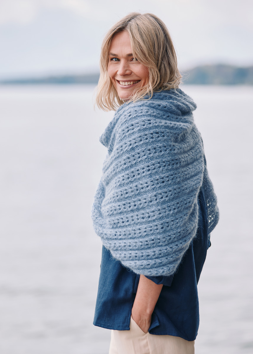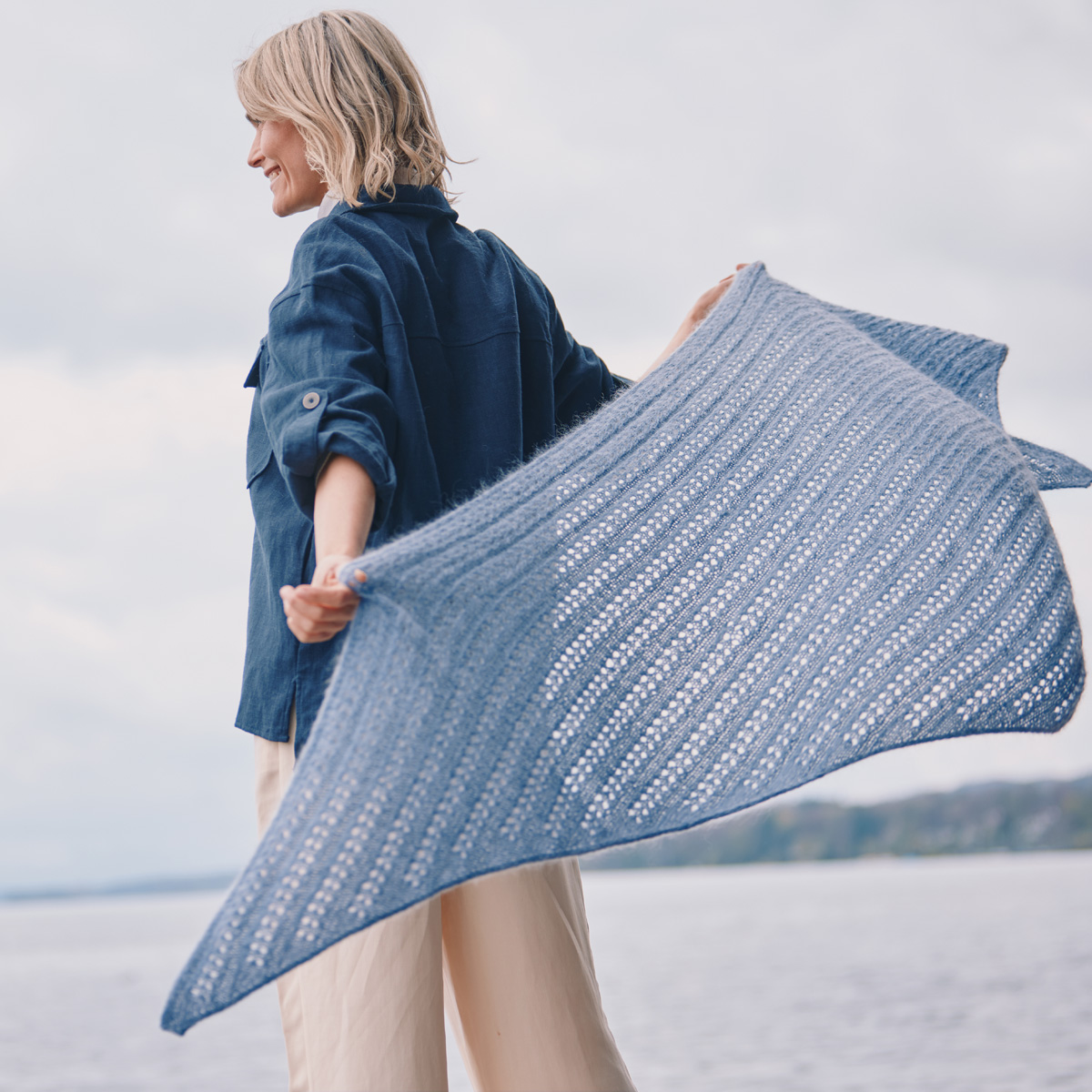 Lana Grossa Cool Wool Lace (100 % ren ny ull (extrafin merino), löplängd 400 m/50 g), 100 g duvblå (färg 2) och Lana Grossa Silkhair (70 % mohair (superkid), 30 % silke, löplängd 210 m/25 g), 100 g himmelsblå (färg 92); 1 rundsticka nr. 5, 80 cm lång. Modellen stickas med dubbla trådar, 1 tråd var av Cool Wool Lace och Silkhair!