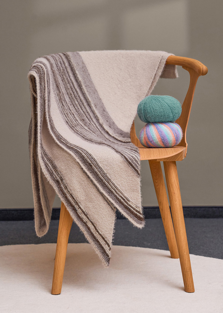 Lana Grossa Cosy Socks (70% ren ny ull (merino), 30% polyamid, LL = ca. 400 m/100 g): 200 g beige (frg 9) og Cosy Socks Soft Stripes (70% ren ny ull (merino), 30% polyamid, LL = ca. 400 m/100 g): 200 g mokka/gråblå/ beige/krem (frg 103); lang rundpinne nr. 3,5.