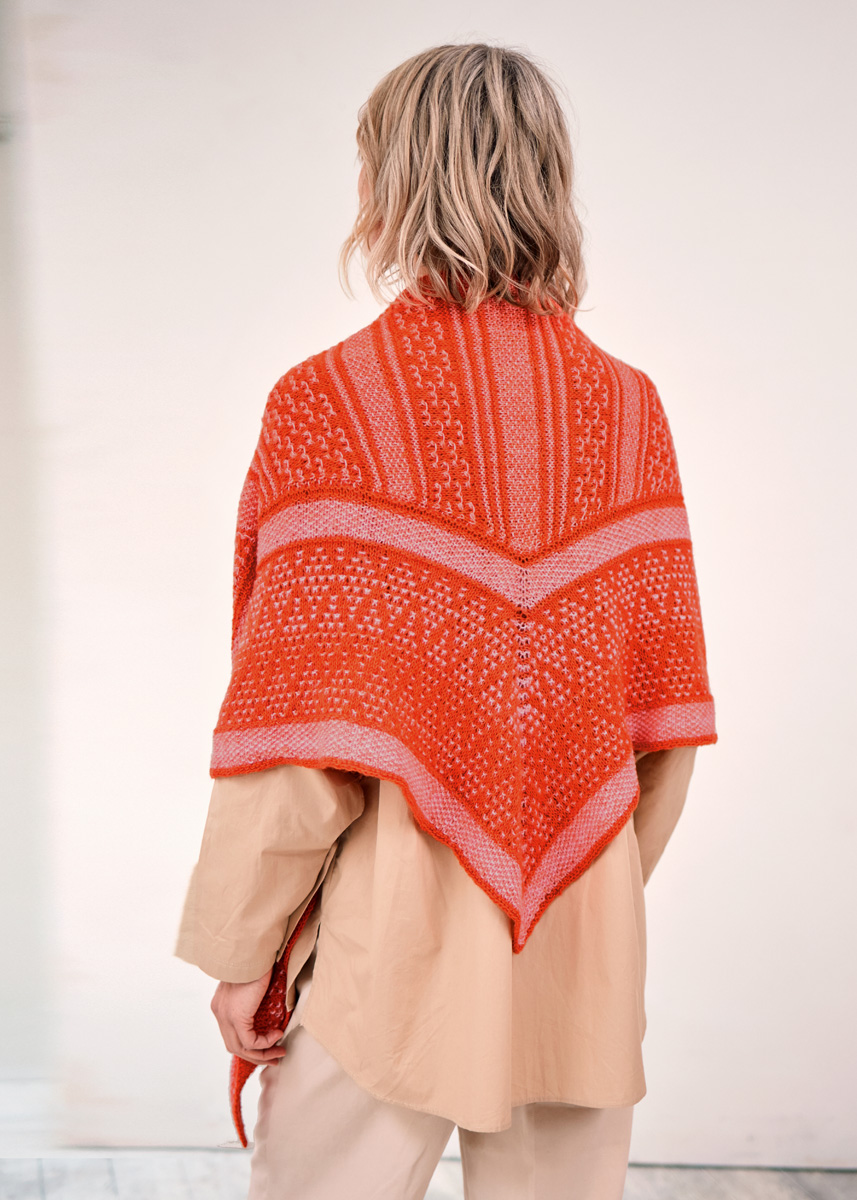 Lana Grossa Ecopuno (72 % bomull, 17 % ren ny ull (merino), 11 % alpacka (baby), löplängd 215 m/50 g), 150 g rödorange (färg 34) och Lana Grossa Ecopuno Dégradé (70 % bomull, 19 % ren ny ull (merino), 11 % alpacka (baby), löplängd 380 m/100 g), 200 g röd/rosa (färg 402); 1 rundsticka nr. 4,5, 100 cm lång.