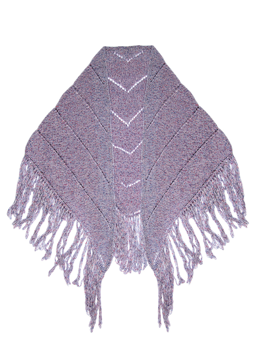 Lana Grossa Ecopuno Print (72% bomull, 17% ren ny ull merino, 11% baby alpacka, löplängd 215 m/50 g), 250 g syren färgrik (färg 104); stickor nr. 4,5, 1 rundsticka nr. 4 och 4,5, 100 cm lång, 1 virknål nr. 3,5 till fransarna.