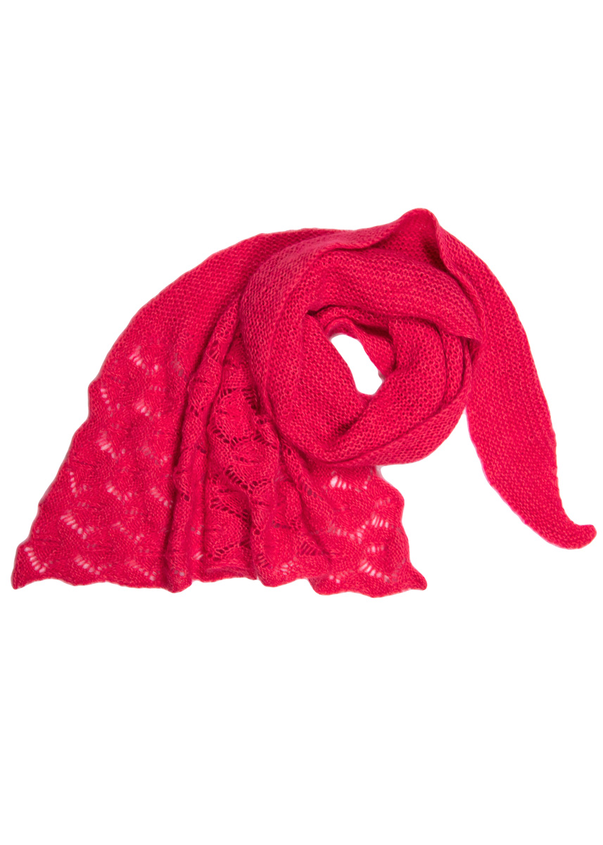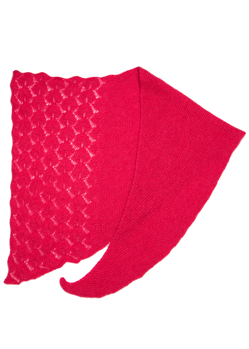 Lana Grossa Ecopuno (72% bomull, 17% ren ny ull merino, 11% baby alpacka, löplängd 215 m/50 g), 150 g hallon (färg 36) och Lana Grossa Silkhair (70% mohair, 30% silke, löplängd 210 m/25 g), 75 g hallon (färg 70); 1 rundsticka nr. 5, 120 cm lång, 1 maskmarkör.