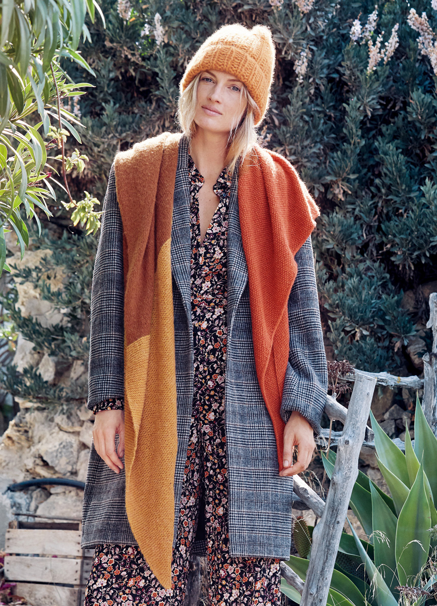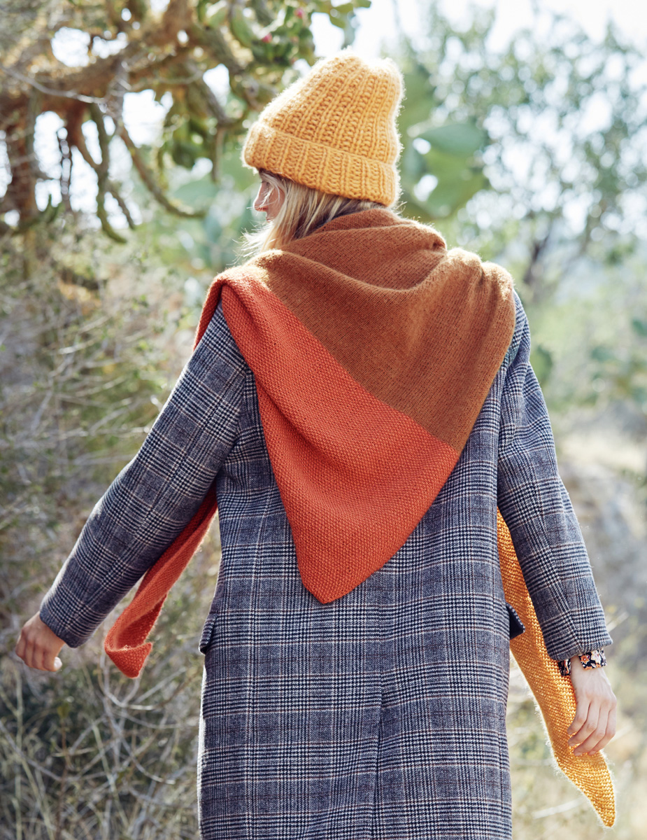 Lana Grossa Ecopuno (72% bomull, 17% ren ny ull merino, 11% baby alpacka, löplängd 215 m/50 g), 100 g i gulorange (färg 33) och 100 g i rödorange (färg 34) samt 150 g i kamel (färg 32); stickor nr. 4,5.