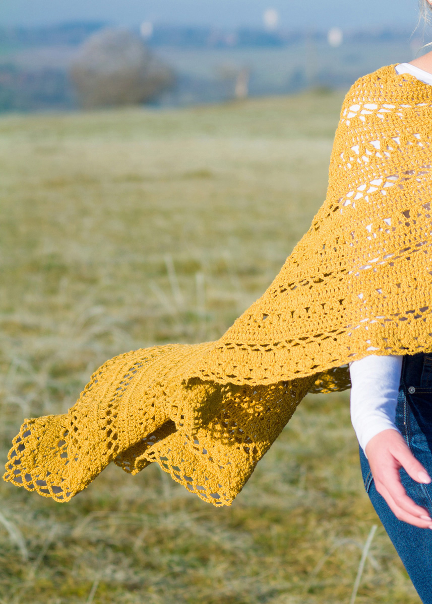Lana Grossa-kvalitet „Landlust Sommerseide“ (50% silke, 50% bomull, löplängd ca. 170 m/50 g) 500 g i guldgul (färg 18), 1 virknål nr. 4.