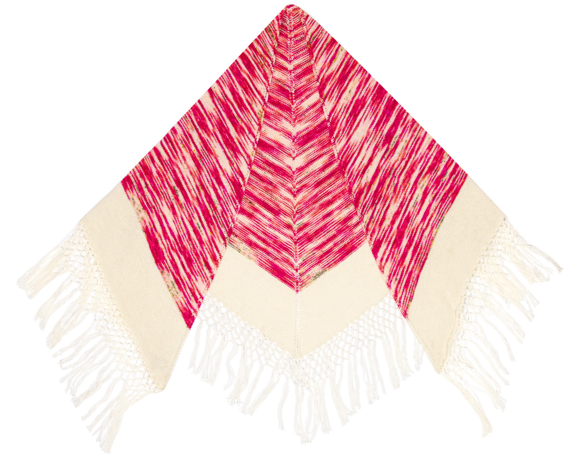 Lana Grossa-kvalitet ”Meilenweit 100 gr Merino hand-dyed” (80 % ren ny uld, 20 % polyamid, løbelængde = ca. 420 m / 100 gr.): 200 gr Adrak (fv 1) og Lana Grossa ”Meilenweit 100 gr Merino Ekstrafin” (75 % ren ny uld, 25 % polyamid, løbelængde = ca. 420 m / 100 gr.): 200 gr hvid (fv 2405), rundpind nr. 3, 100 cm, hæklenål nr. 3 til at knytte frynser med.