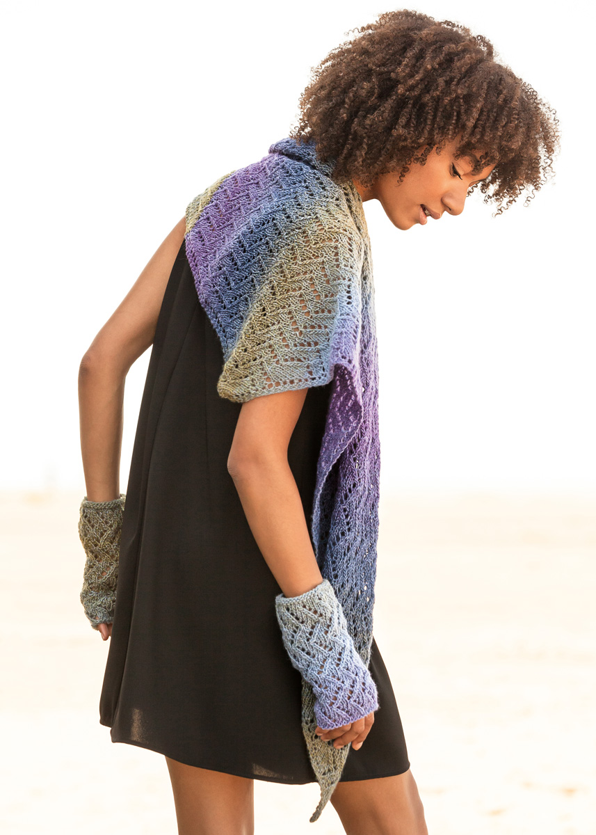 Trekantssjal 166 x 68 cm, b x l; Pulsvärmere 21 x 23 cm, o x l