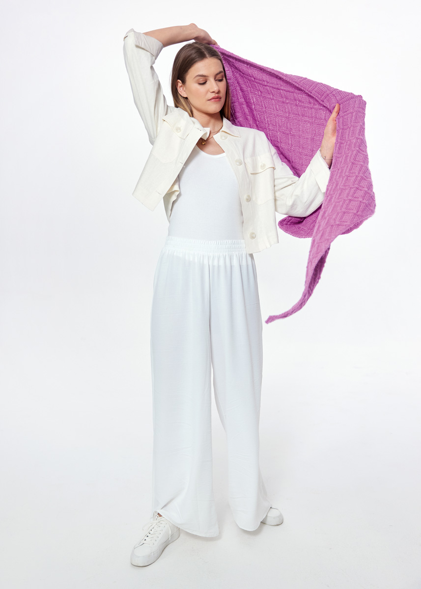 Lana Grossa Setosa (65% ren ny ull (merino superfin), 35% silke, löplängd 150 m/50 g), 300 g orkidé (färg 11); 1 rundsticka nr. 4,5, 80 cm lång.