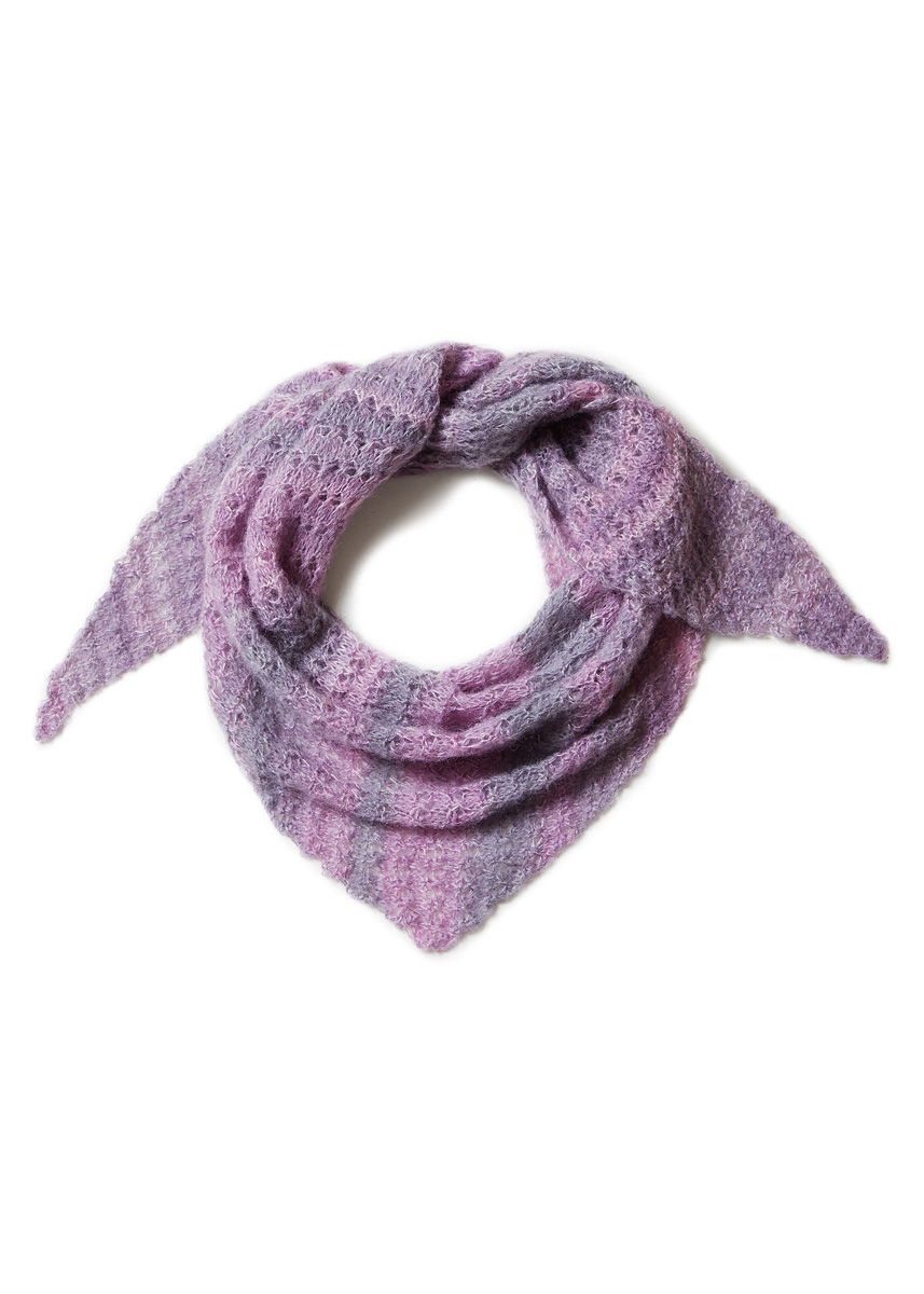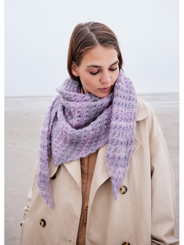Lana Grossa-kvalitet „Silkhair Print“ (70 % mohair (superkid), 30 % silke, löplängd = ca 210 m/25 g): ca 125 g syren/ rosa/grå/musgrå (färg 429); stickor nr. 5,5. Trekantssjalen stickas med dubbla trådar.