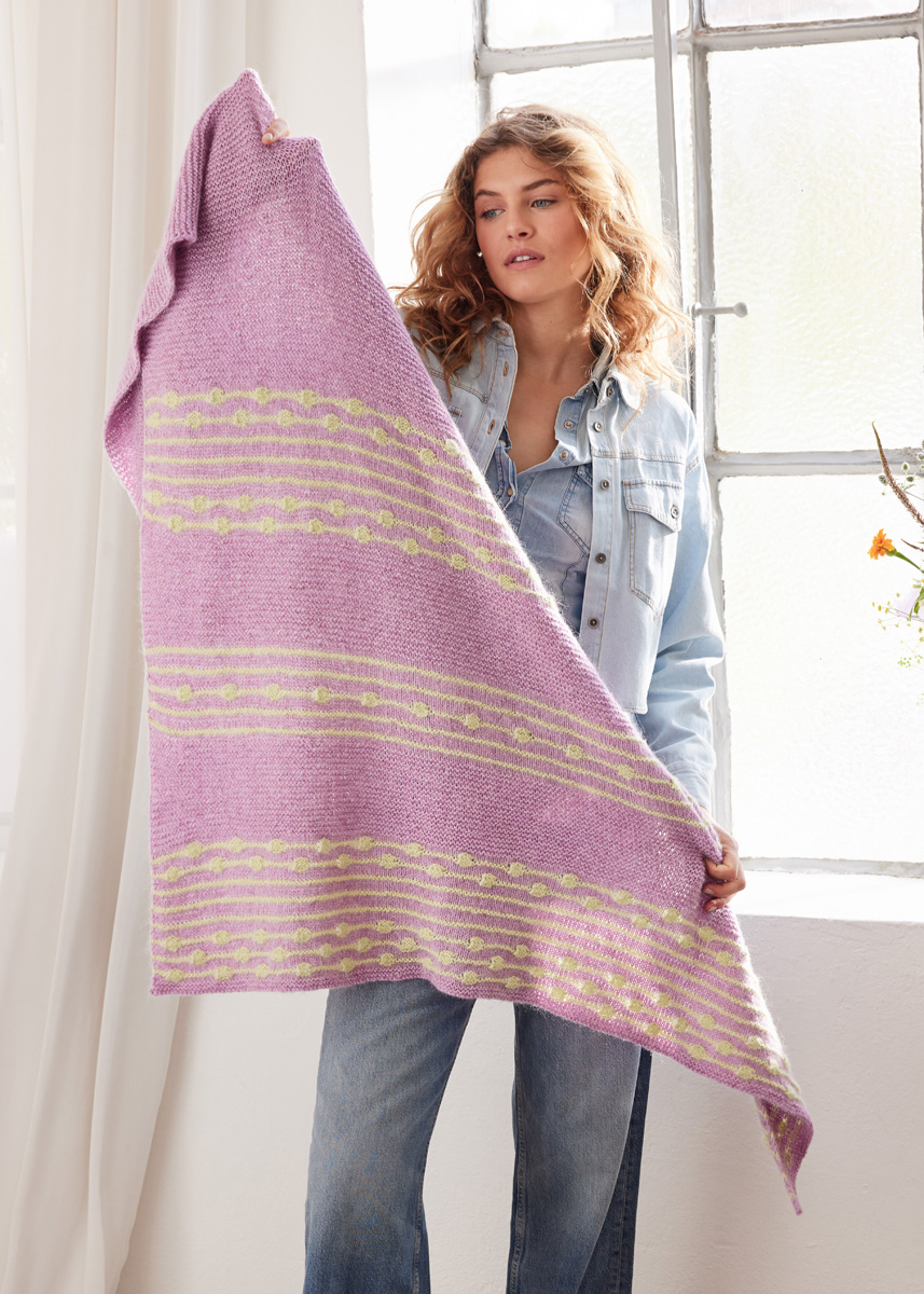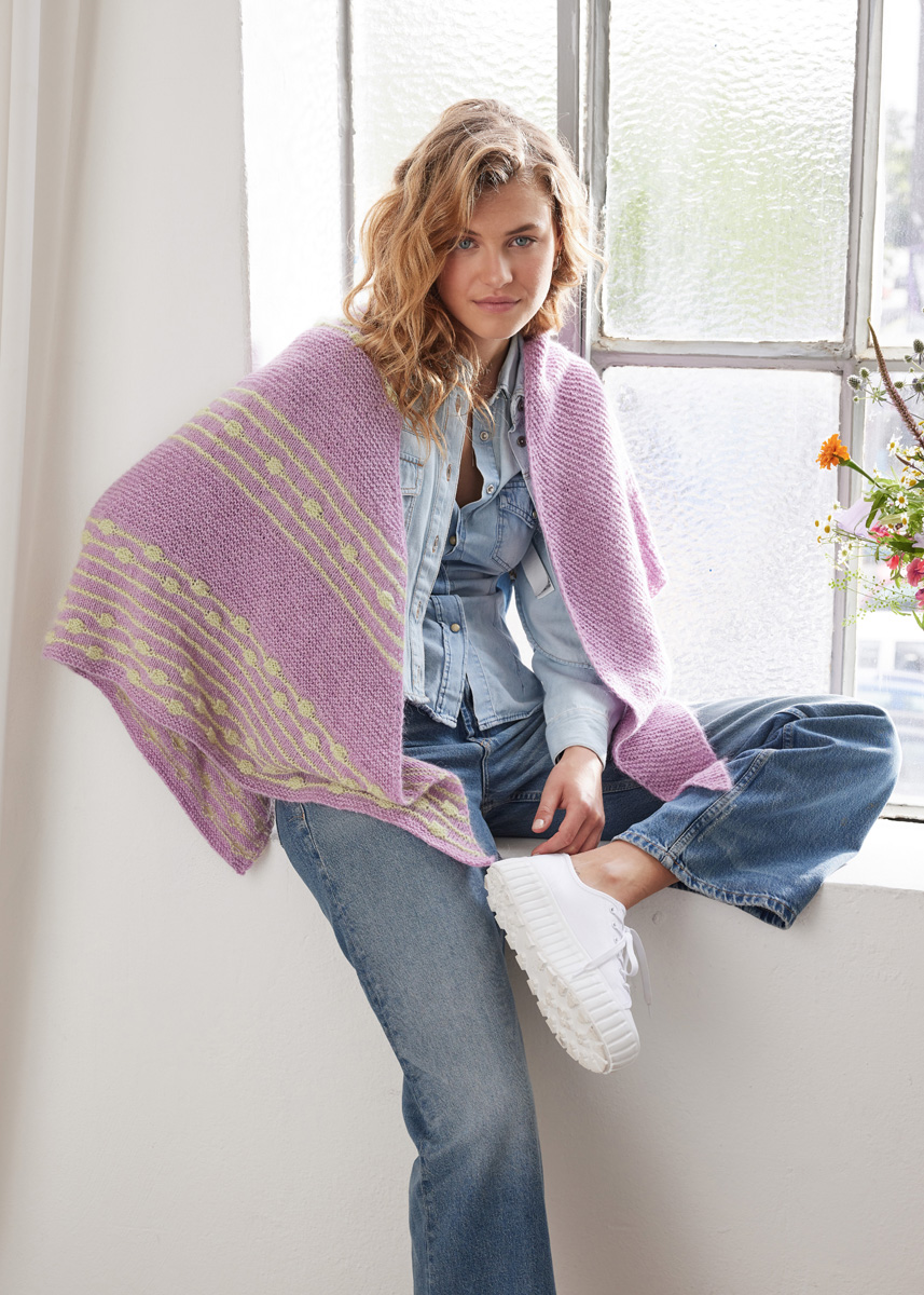 Materiale: Lana Grossa-kvalitet ”Ecopuno” (72 % bomuld, 17 % ren ny uld (merino), 11 % alpaka (baby), løbelængde = ca. 215 m / 50 gr.): ca. 200 gr syrenlilla (fv 83 = Garn A1) og 50 gr lys grøn (fv 78 = Garn B1) og Lana Grossa-kvalitet ”Setasuri” (69 % alpaka (suri), 31 % silke, løbelængde = ca. 212 m / 25 gr.): ca. 100 gr geranierosa (fv 47 = Garn A2) og 25 gr hvidgrøn (fv 29 – Garn B2), rundpind nr. 4, 80 – 100 cm, stoppenål, saks.