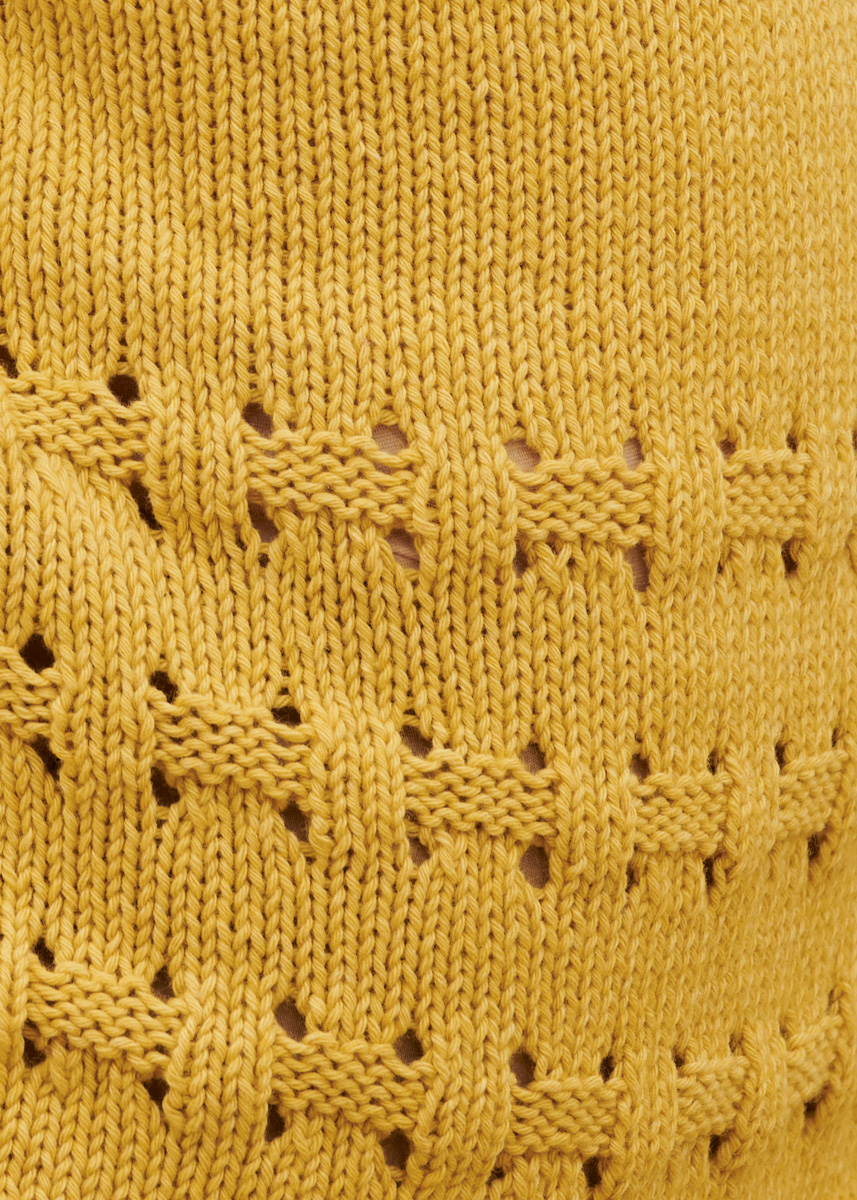 Lana Grossa-kvalitet „Fourseason” (45 % ren ny ull bio (merino extrafin), 40 % bio bomull, 15 % återvunnen kashmir, löplängd = ca. 105 m/50 g): ca. 350 (400) g [7 (8) nystan] gul (färg 8); stickor nr. 5.