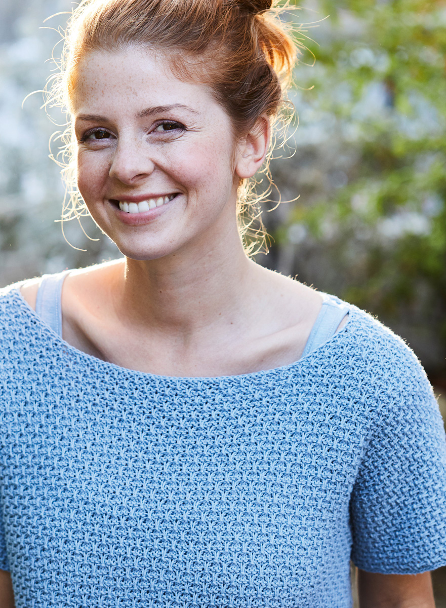 Lana Grossa-Kvalitet „Landlust Sommerseide“ (50% silke, 50% bomull, löplängd ca. 170 m/50 g); ca. 300 (350 – 350 – 400) g ljus blå (färg 6); stickor nr.3 – 3,5