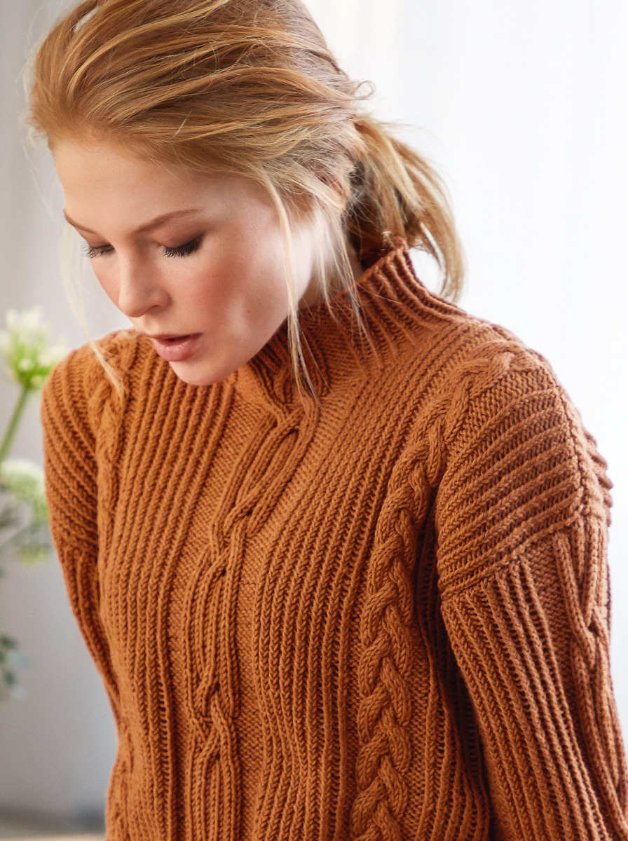 Lana Grossa-kvalitet „Cool Wool Big Mélange“ (100% virgin ull, löplängd ca. 120 m/50 g) ca. 650 (700 - 750 - 800) g terracotta melerad (färg 348); stickor och en kort rundsticka nr. 5, en hjälpsticka