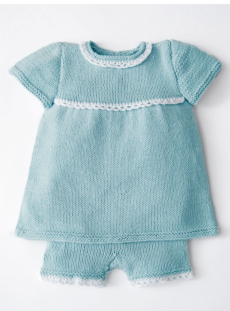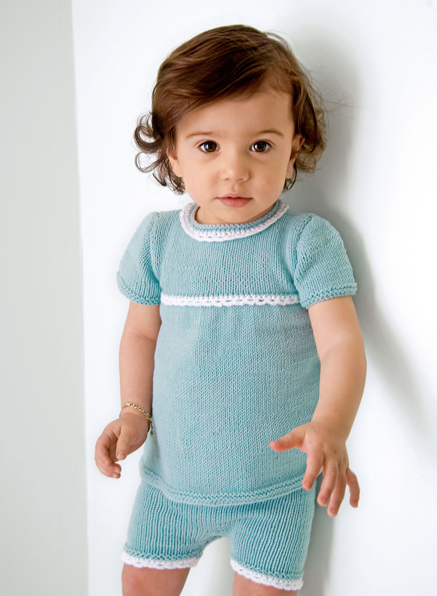 Lana Grossa Elastico (96 % Baumwolle, 4 % Polyester (Elité), Lauflänge 160 m/50 g) je 150 g Zartblau (Fb 130) und 50 g Ecru (Fb 36); Stricknadeln Nr. 3,5, eine 40 cm lange Rundstricknadel Nr. 3,5 oder Spielstricknadeln Nr. 3,5, Häkelnadel Nr. 3; ein Knopf und 2 cm breites Gummiband.