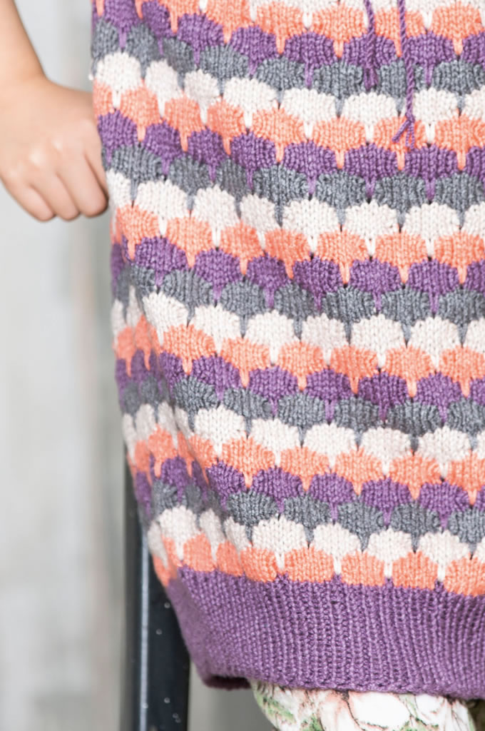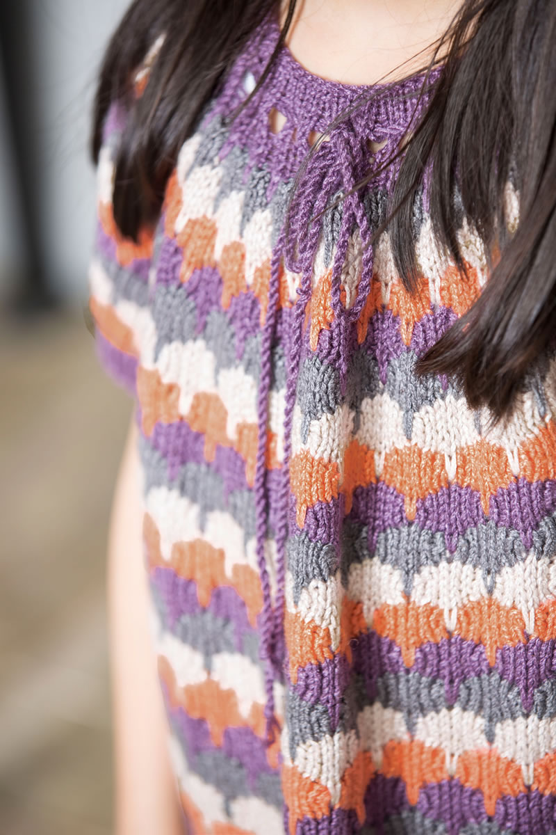 Lana Grossa Qualität „Linarte“ (40% Viskose, 30% Baumwolle, 20% Leinen, 10% Polyamid, LL = 125 m/50 g), ca. 150 (200) Violett (Fb 31) und je ca. 100 (150) g Dunkelgrau (Fb 46), Beige (Fb 62) und Zimtbraun (Fb 53), je 1 kurze und 1 lange Rundstricknadel Nr. 3 und 4.