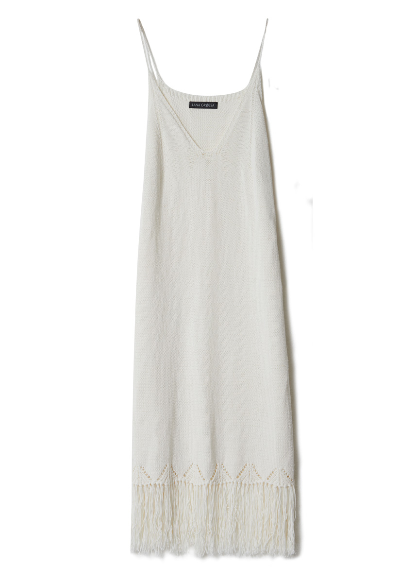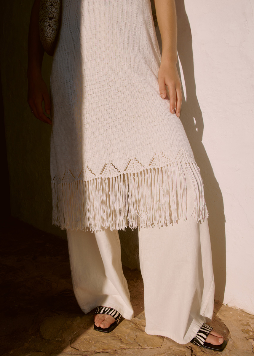 Lana Grossa-kvalitet „Solo Lino“ (80 % rec. hør, 20 % hør, løbelængde = ca. 120 m / 50 gr.): ca. 550 gr hvid (fv 1), strikkepinde nr. 3 og 3½, hæklenål nr. 3 og 5.