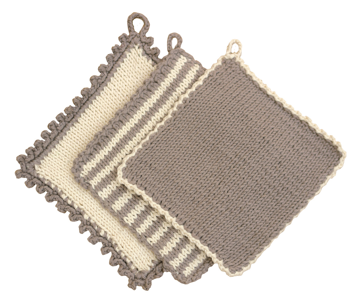 Lana Grossa-kvalitet ”Star” (100 % bomuld), løbelængde = ca. 90 m / 50 gr.): 50 gr taupe (fv 59) og 50 gr natur (fv 27), strikkepinde nr. 3½, hæklenål nr. 4.